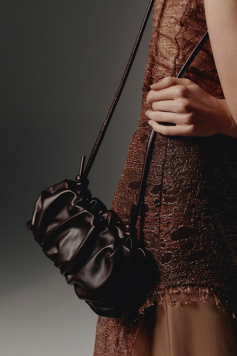 حقيبة روزي، بطياتها الطبيعية الناعمة ومقبضها الطويل المزين بعقد مزخرفة، تُفاجئكِ باتساعها وسهولة حملها. مصنوعة من جلد الحمل الناعم.