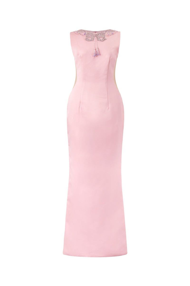 فستان إلسيترا ضيق مزين بفيونكة ترتر باللون الوردي الفاتح