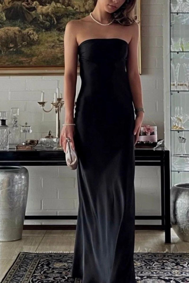 يبدأ الفستان بفتحة رقبة نظيفة بدون حمالات تعرض عظمة الترقوة، وتتدفق بسلاسة إلى نمط مستقيم يلامس الأرض ويتحرك بجودة انسيابية تشبه السائل تقريبًا. يكشف الالتفاف حول الفستان عن البراعة الحقيقية للتصميم - ظهر عميق ينخفض برشاقة، مما يوفر لمسة من الدراما ولمسة من الرقي.