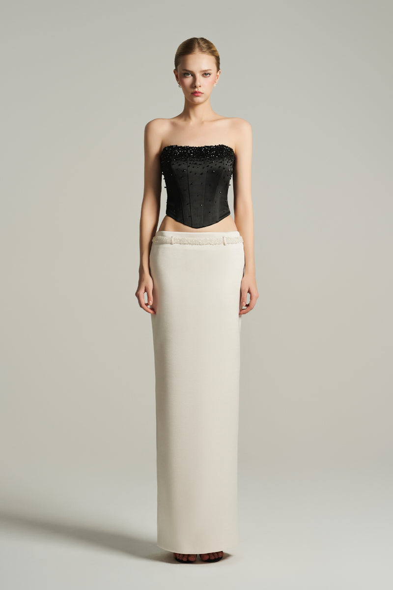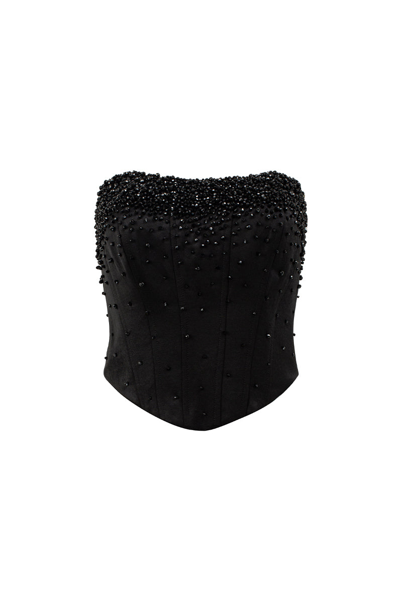 صدرية كورسيه بدون حمالات، مزينة بزخارف كريستالية يدوية الصنع على الصدر لإضفاء لمسة لامعة. مصممة بعظام منظمة لمنحها شكلاً منحوتاً، تمزج هذه القطعة بأناقة بين الأناقة العصرية وتقنيات الكورسيه الخالدة.