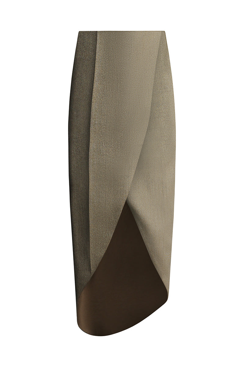 تتميز التنورة المصممة خصيصًا والمستوحاة من التكعيبية بتصميم منظم مع تفاصيل مقطوعة متطورة، وهي مصنوعة من تويد فرنسي فاخر.