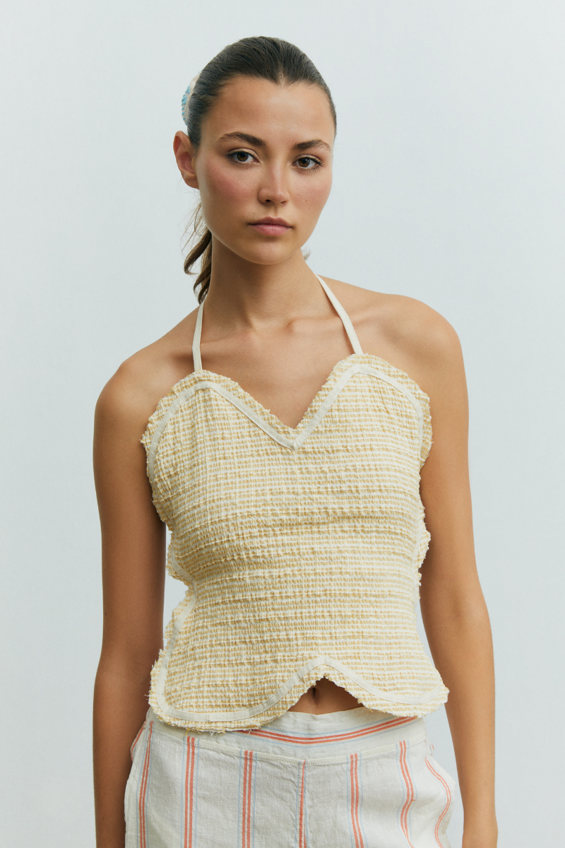 بلوزة فاخرة على شكل فراشة مع قماش برباط وتفاصيل دانتيل معقدة على الظهر، مصنوعة يدويًا في تركيا.