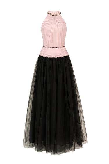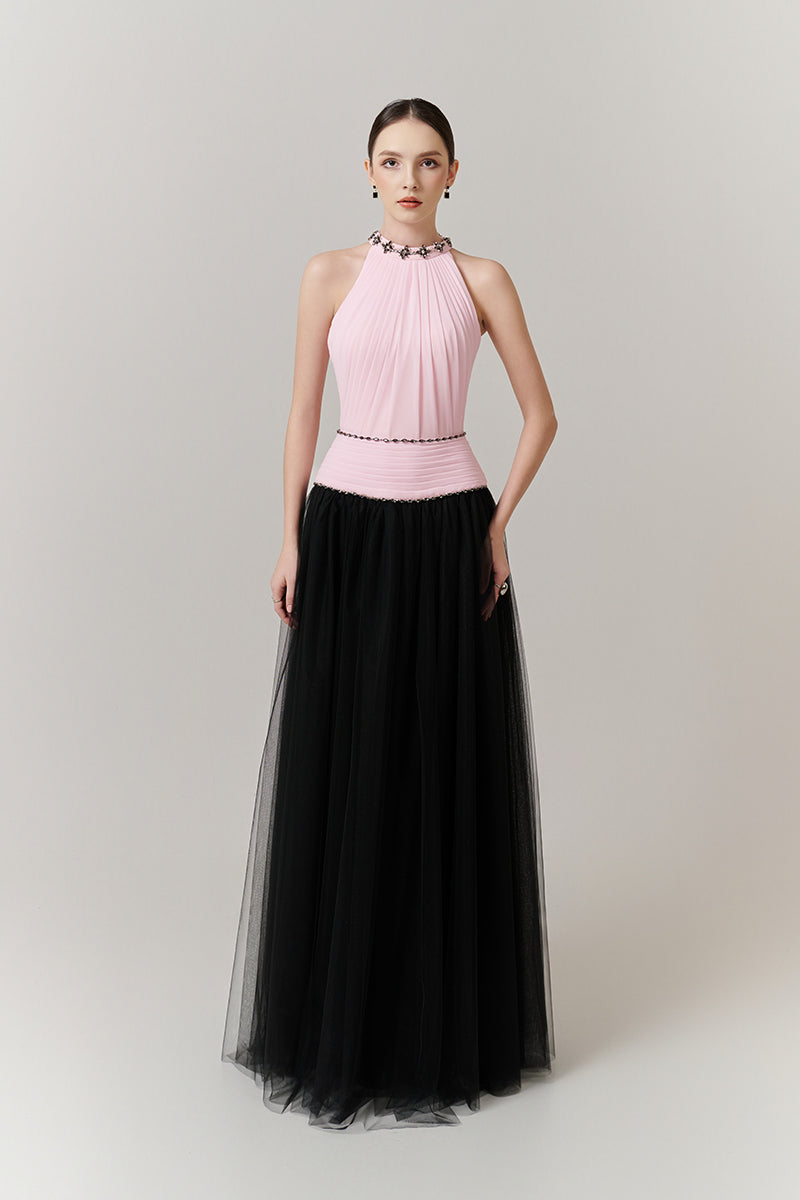 فستان ماكسي بياقة هالتر وقصة واسعة من الأسفل