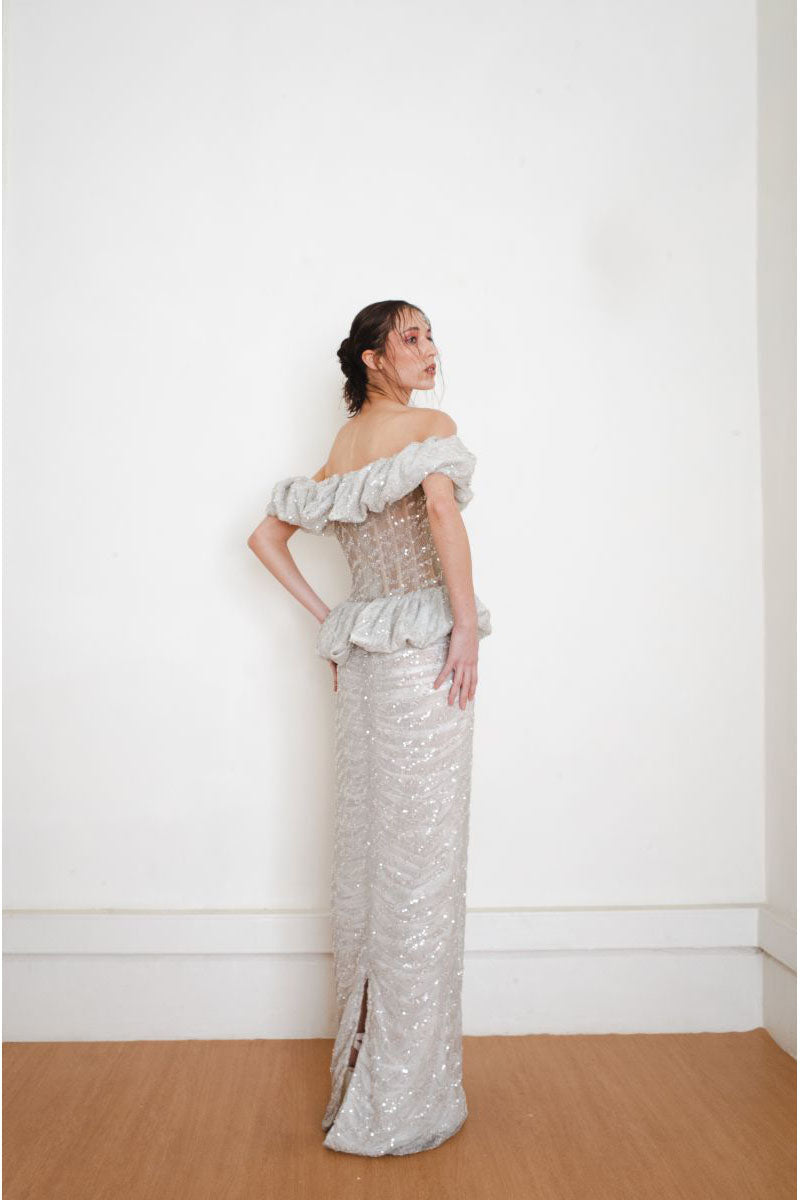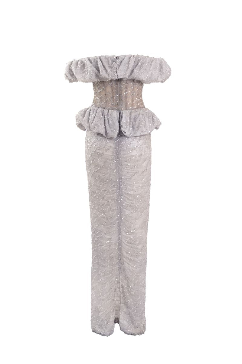فستان مكشوف الكتفين مصنوع من التول الفضي المزخرف والمُغطى بطبقة من التول الأبيض المنسدل في التنورة، ويتميز بجزء علوي ضيق مع دعامات ظاهرة وكشكشة منحوتة عند خط العنق والوركين.