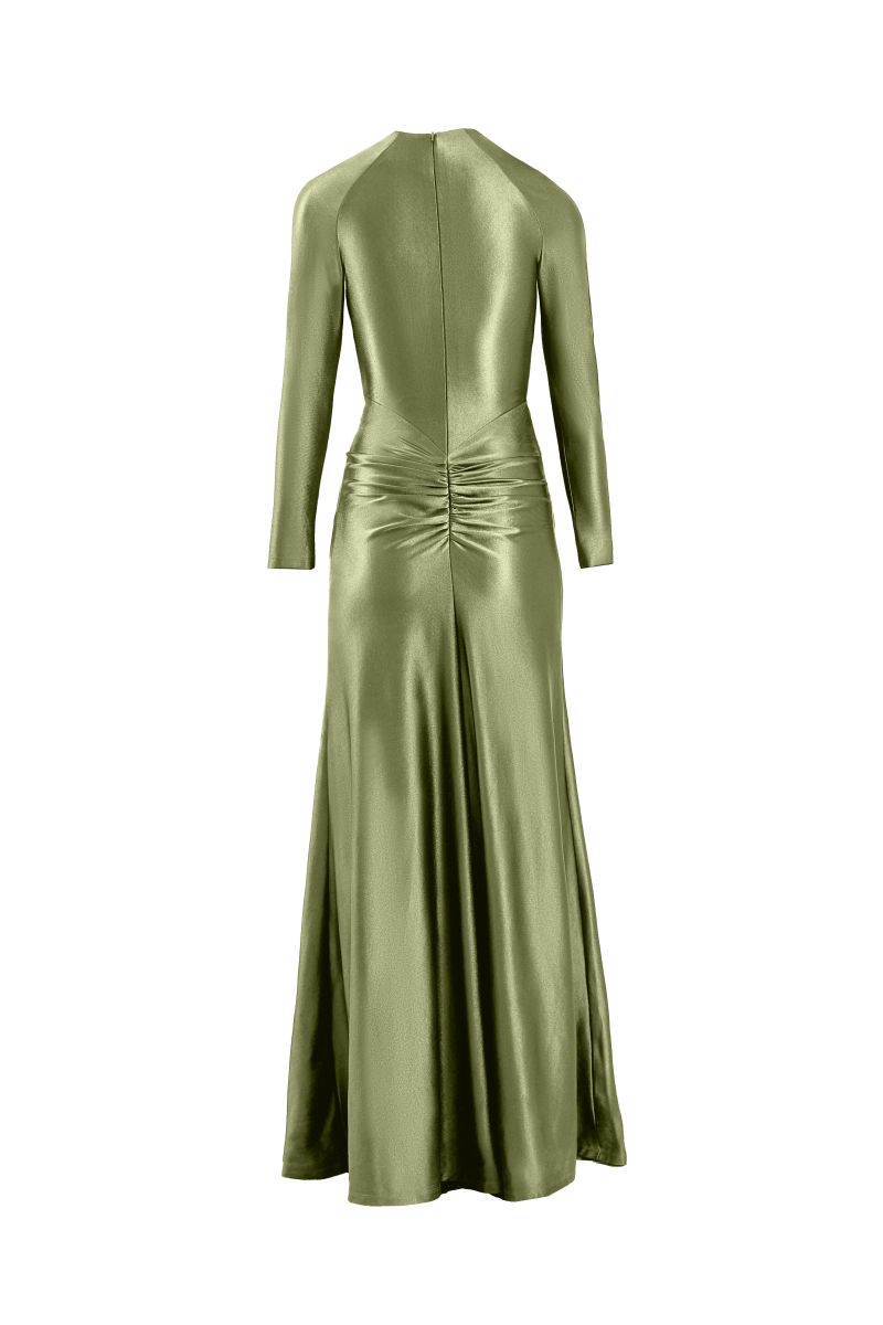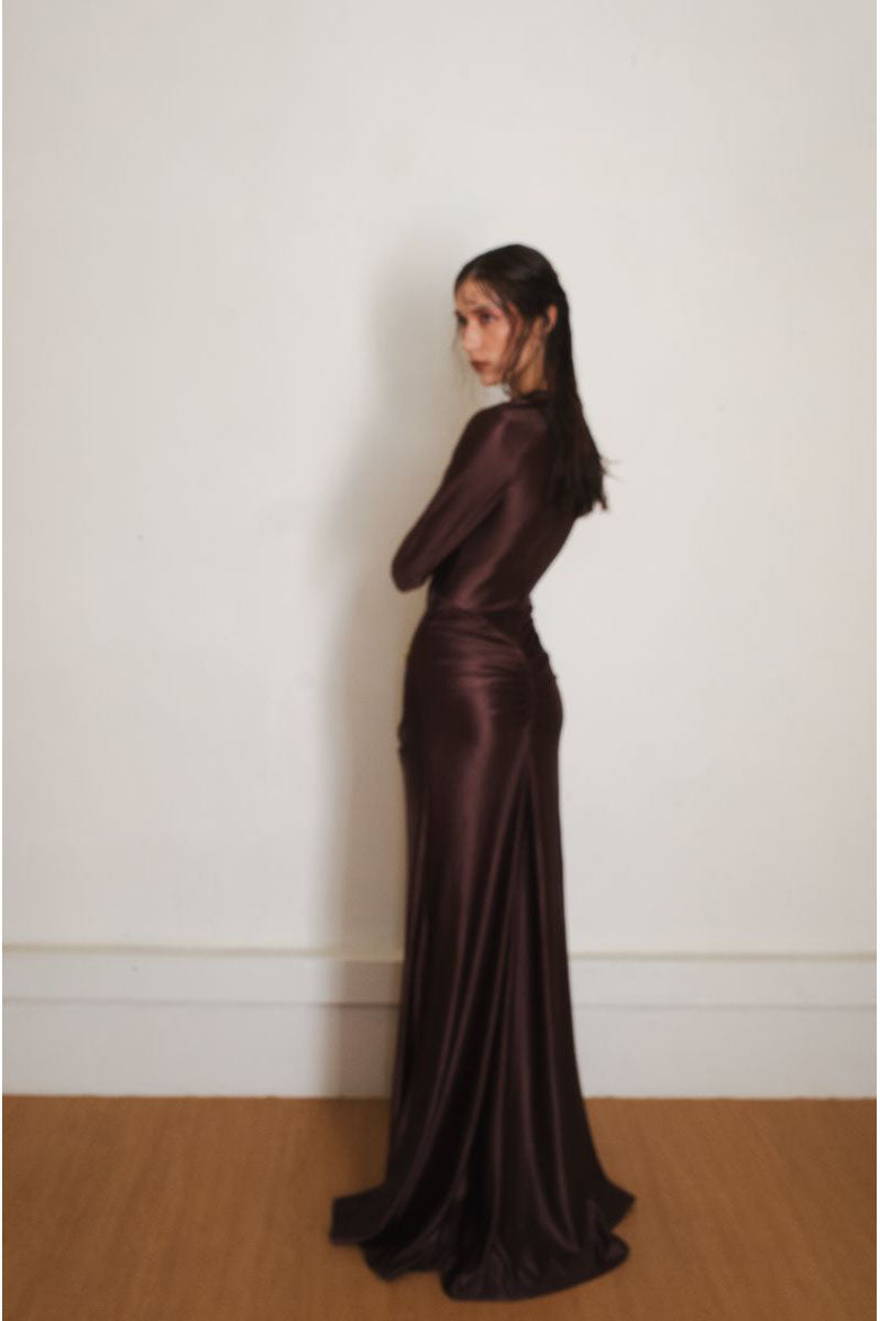 فستان بأكمام طويلة مصنوع من قماش جيرسي مطاطي لامع بلون بني صدئ، يتميز بياقة عالية، وتفاصيل خياطة زاوية عند الصدر، وتجاعيد في منتصف الجزء الأمامي.