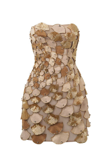 فستان بوستير بدون أكمام، مزين بخرز بارز، يُبرز أناقة ورقيًا. بتصميمه الضيق وتفاصيله الزخرفية الرائعة، يُعد هذا الفستان الخيار الأمثل للمناسبات الخاصة.