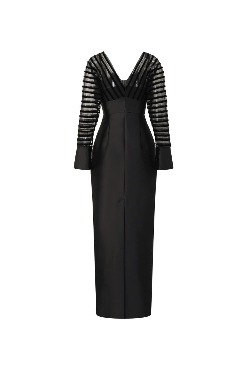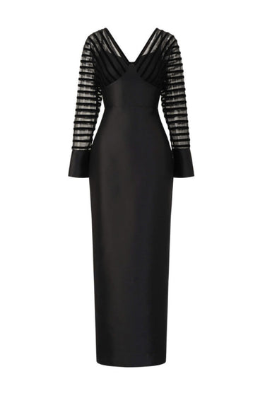 فستان ضيق مصنوع من التافتا والشبك، مزين بتطريزات مخملية يدوية الصنع بدقة متناهية. يبرز التصميم جمال القوام بأناقة راقية وجاذبية مميزة.