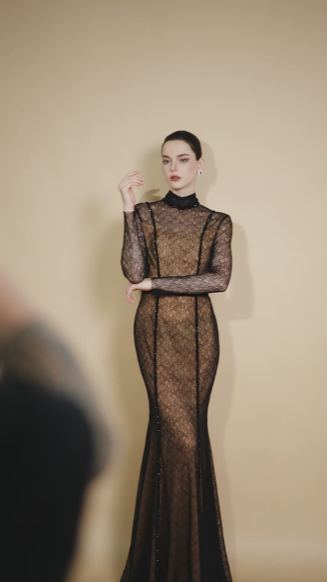 هذا الفستان بقصة حورية البحر بياقة مرتفعة وأكمام طويلة، يُجسّد الأناقة الجريئة وعمق الملمس. مصنوع من دانتيل الغيبور المتشابك، ومُحاط بمخمل ليون الفاخر، ليُبرز جمال الجسم بدقة وإتقان. تُضفي الياقة المرتفعة والأكمام الطويلة لمسةً من الرسمية الراقية، بينما تُزيّن الكريستالات خط العنق وخطوط التصميم المزدوجة، مُضيفةً لمعانًا رقيقًا. يُحدّد حزام فيونكة مخملي صغير الخصر، مُكمّلًا إطلالةً مُصمّمة لأمسيات تجمع بين القوة والرزانة.