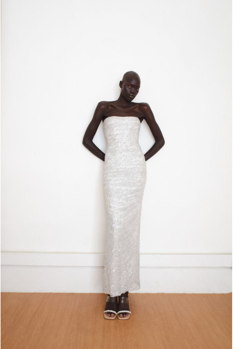 فستان بدون حمالات مصنوع من التول الفضي المطرز، ينسدل بانسيابية على الجسم ليمنحه قواماً أنيقاً ومنحوتاً. يتميز الجزء العلوي منه بكورسيه داخلي مزود بدعامات.