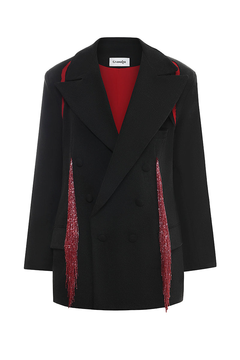 بليزر جينز مزدوج الصدر مزين بشراشيب مطرزة بالخرز