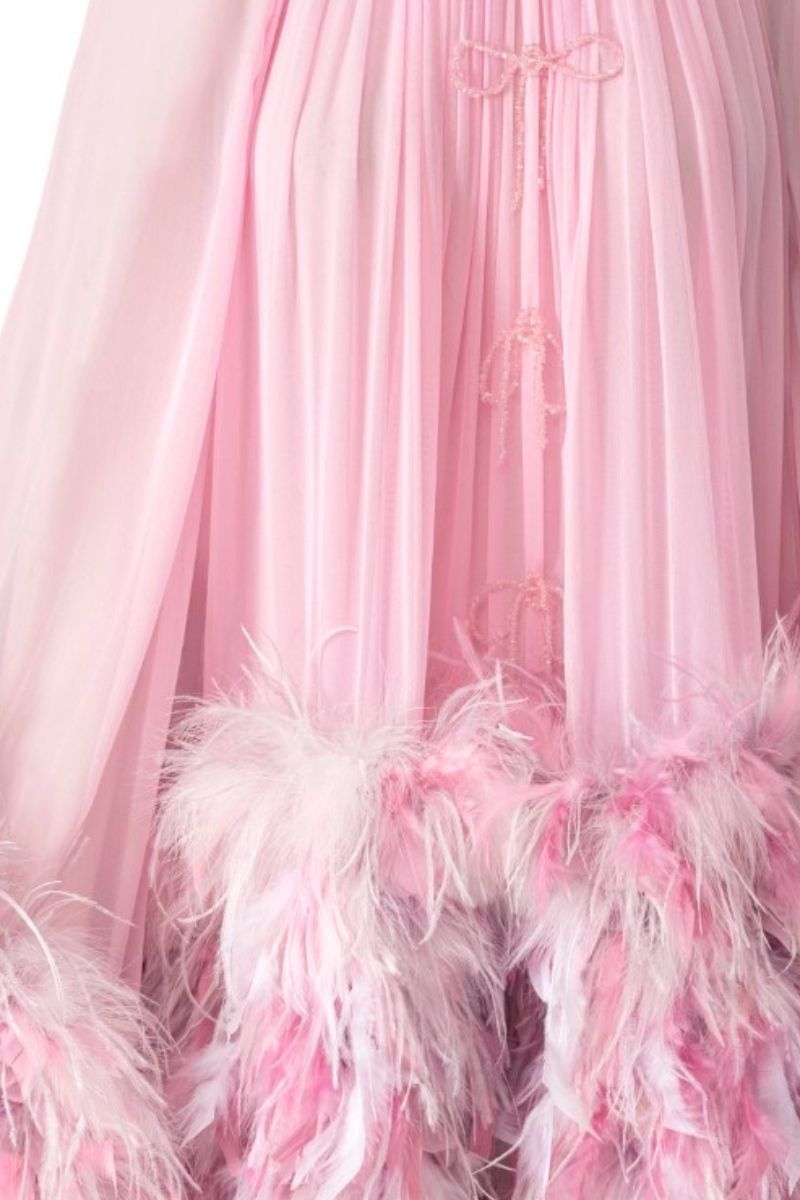فستان ANNIE CHIFFON FUNNEL MINI DRESS مصنوع من الشيفون والتول خفيف الوزن، ويتميز برقبة دائرية وأكمام على شكل قمع مع صدر مجمع وربطة عنق من الخرز مرفقة. يزين الريش والكريستال المرفق يدويًا الأكمام وحاشية الفستان، مما يزيد من المظهر.
