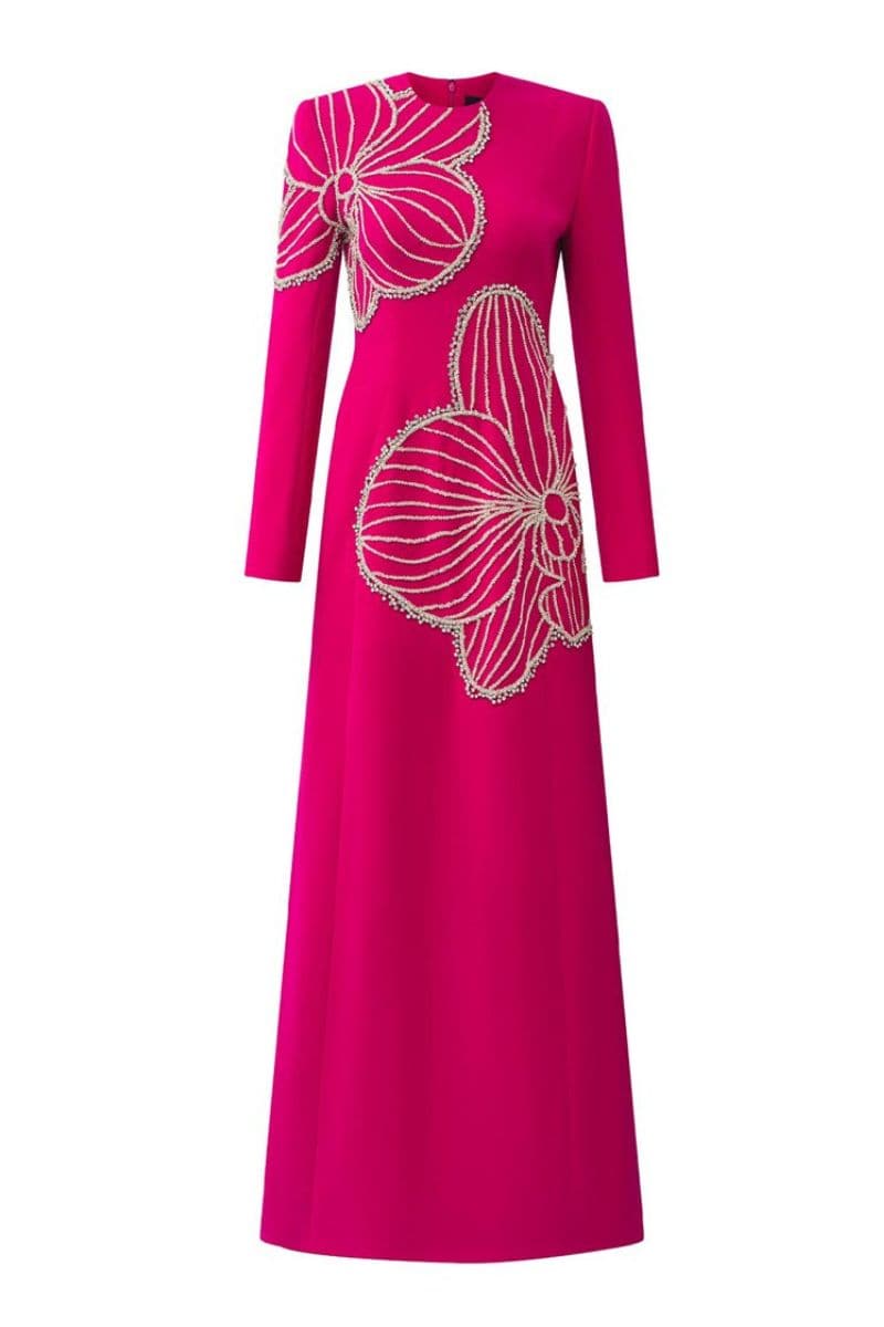 فستان فوشيا وردي اللون مع ياقة دائرية ومزين بالكريستال