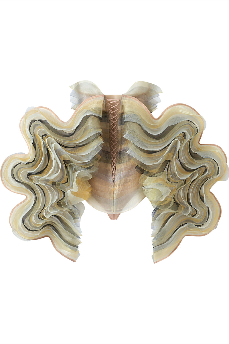 يتميز هذا الفستان بتصميم فنيّ متناسق، بطبقات شفافة متدفقة بألوان محايدة كالبيج والبني الفاتح والرمادي. يتميز الجزء العلوي بتأثير مموج متقن، مما يمنح الفستان مظهرًا انسيابيًا ومنحوتًا. يتميز الجزء الخلفي من الفستان بتموجات دراماتيكية تمتد إلى الخارج، مما يضفي لمسة من الحركة الديناميكية.