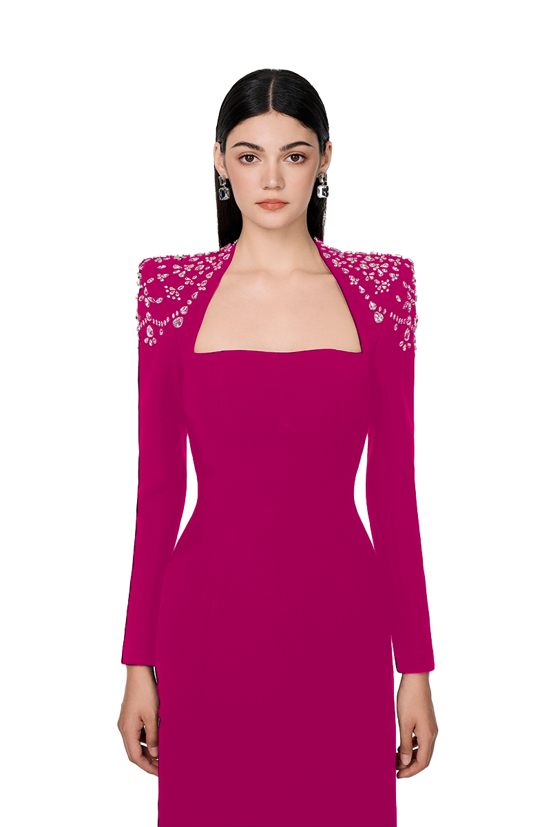 يتميز هذا الفستان الوردي الكامل الفاخر والمصنوع يدويًا في فيتنام، بتصميم مجسم مع صورة ظلية بطول الأرض وخط عنق شبه منحرف مذهل مزين بأحجار الكتف.