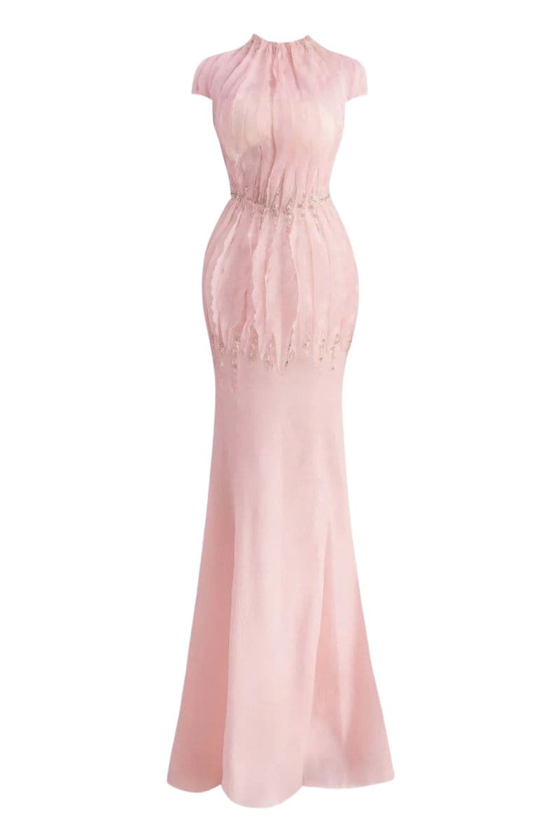 فستان أورجانزا وردي طويل متعدد الطبقات