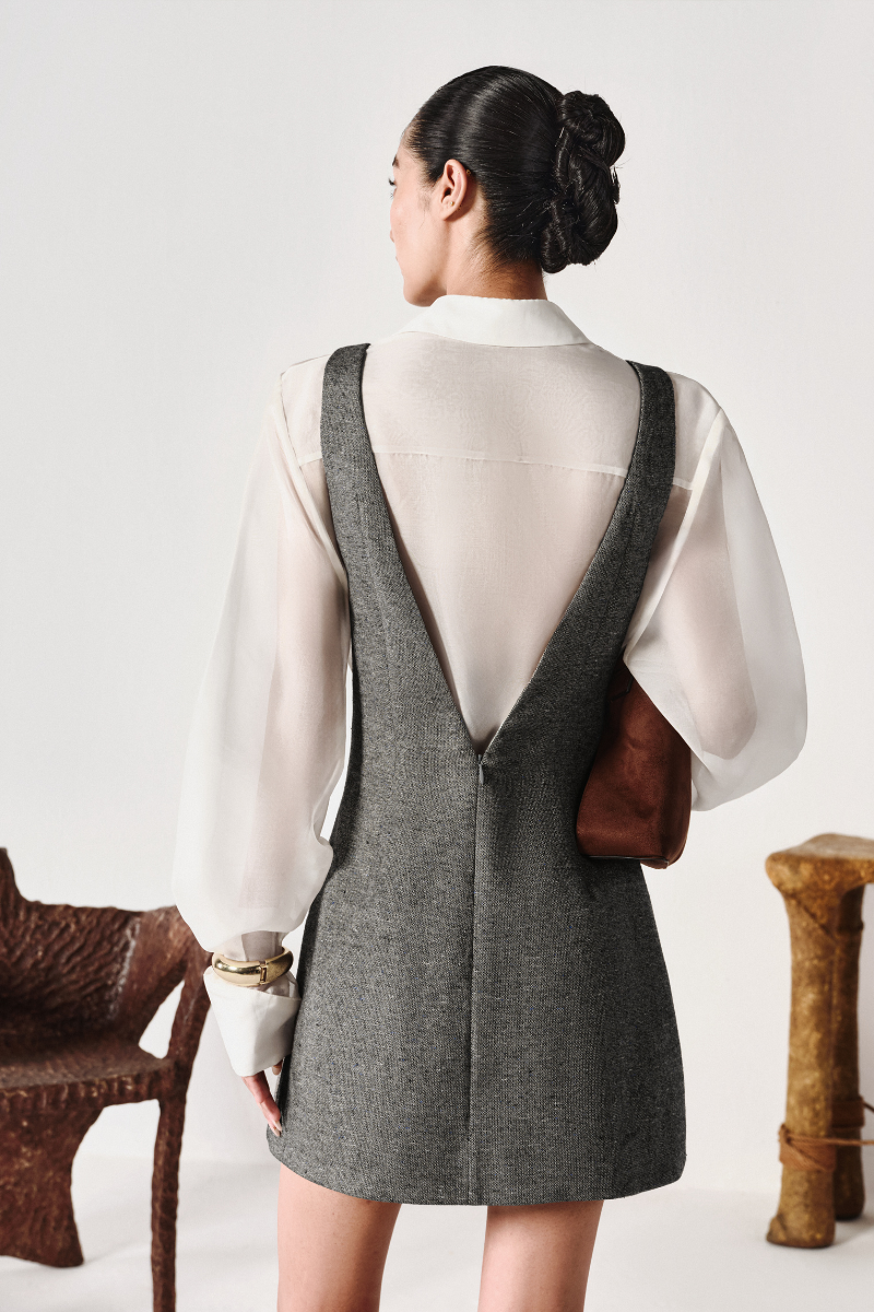 فستان من قماش تويد عالي الجودة بنسبة 100% مصنوع في اليابان بفتحة رقبة على شكل حرف V لإطلالة مريحة وعصرية في نفس الوقت. هذا القماش الفاخر سهل الارتداء والغسل، وجيد التهوية للغاية للارتداء اليومي.