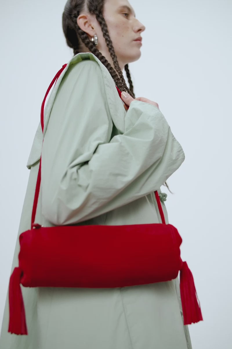 حقيبة كروس بودي أسطوانية من جلد الغزال مع حزام رفيع قابل للتعديل وشرابات مزخرفة