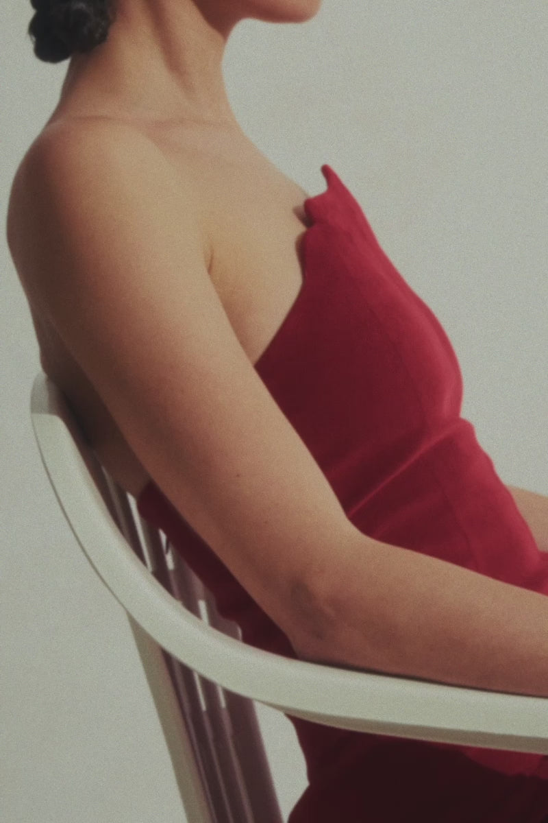 فستان مخملي بطول الركبة، بحافة علوية مُشكَّلة، يتميز بإغلاق خلفي وشق في المنتصف.