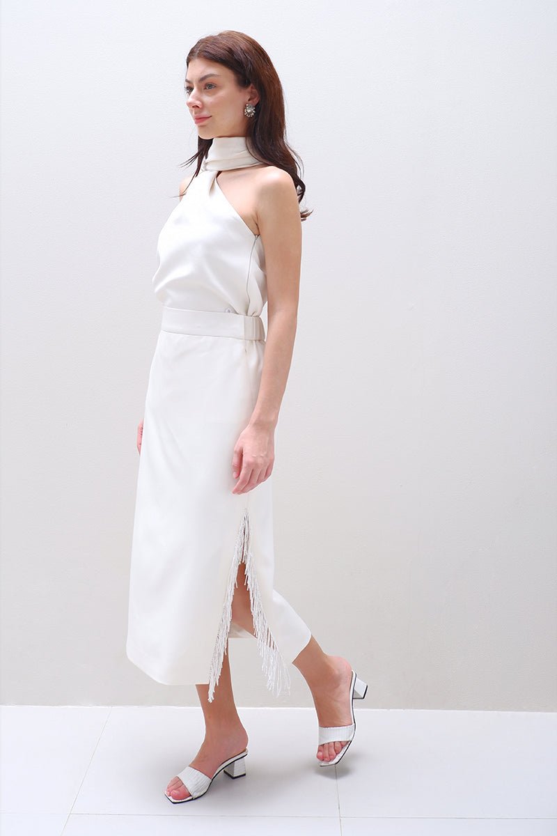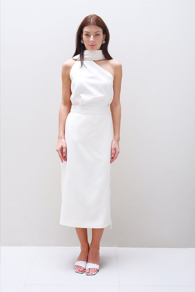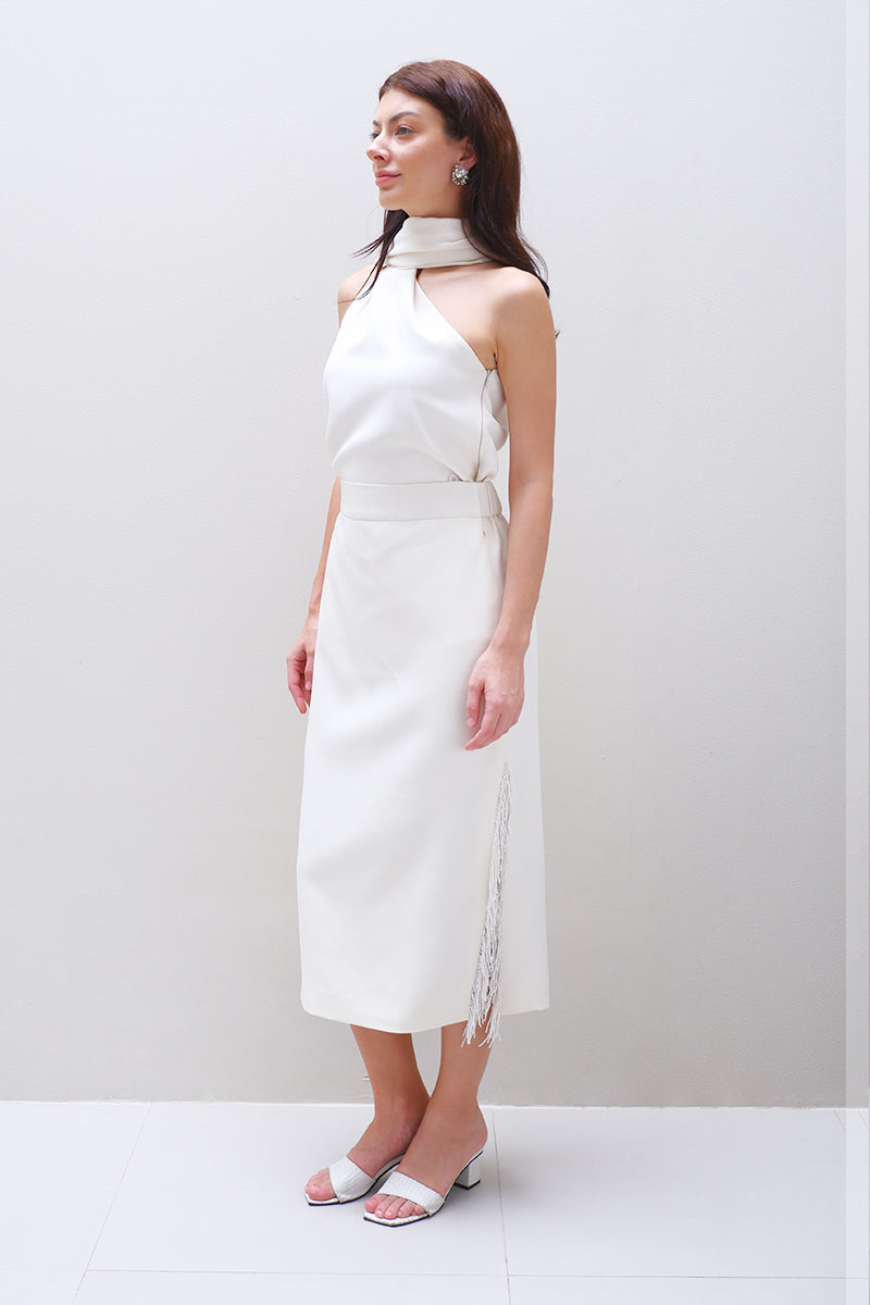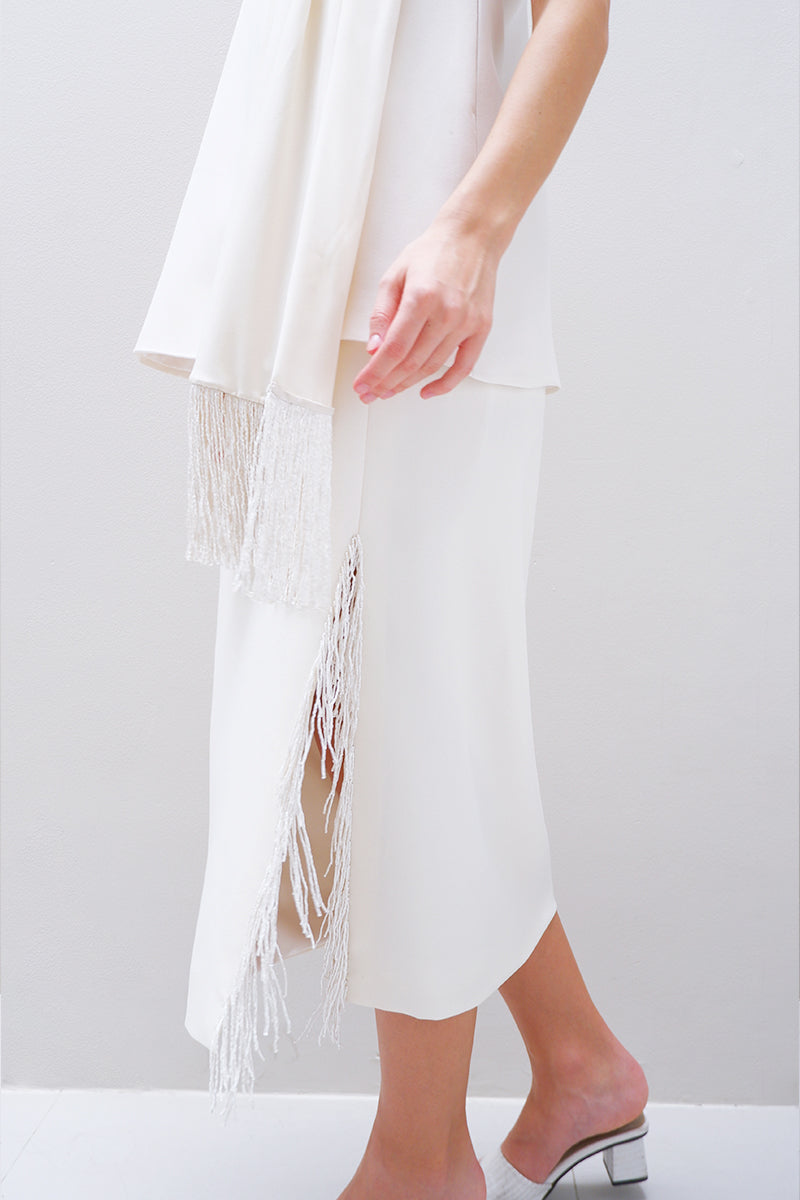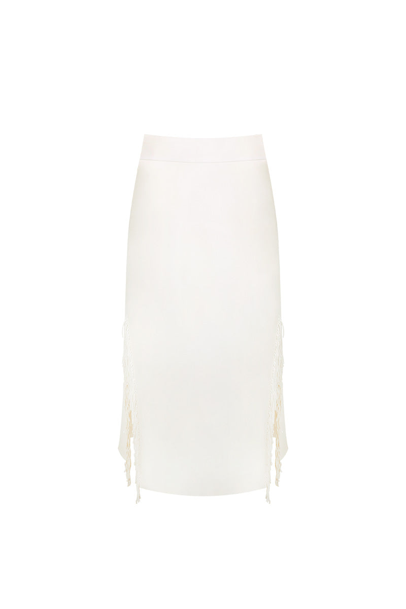 تنورة ميدي كريمية بقصّة أنيقة، بفتحات جانبية مزينة بشراشيب من الخرز الزجاجي بلون أبيض عاجي. تصميم بسيط وأنيق بلمسة من الأناقة.