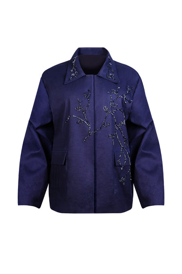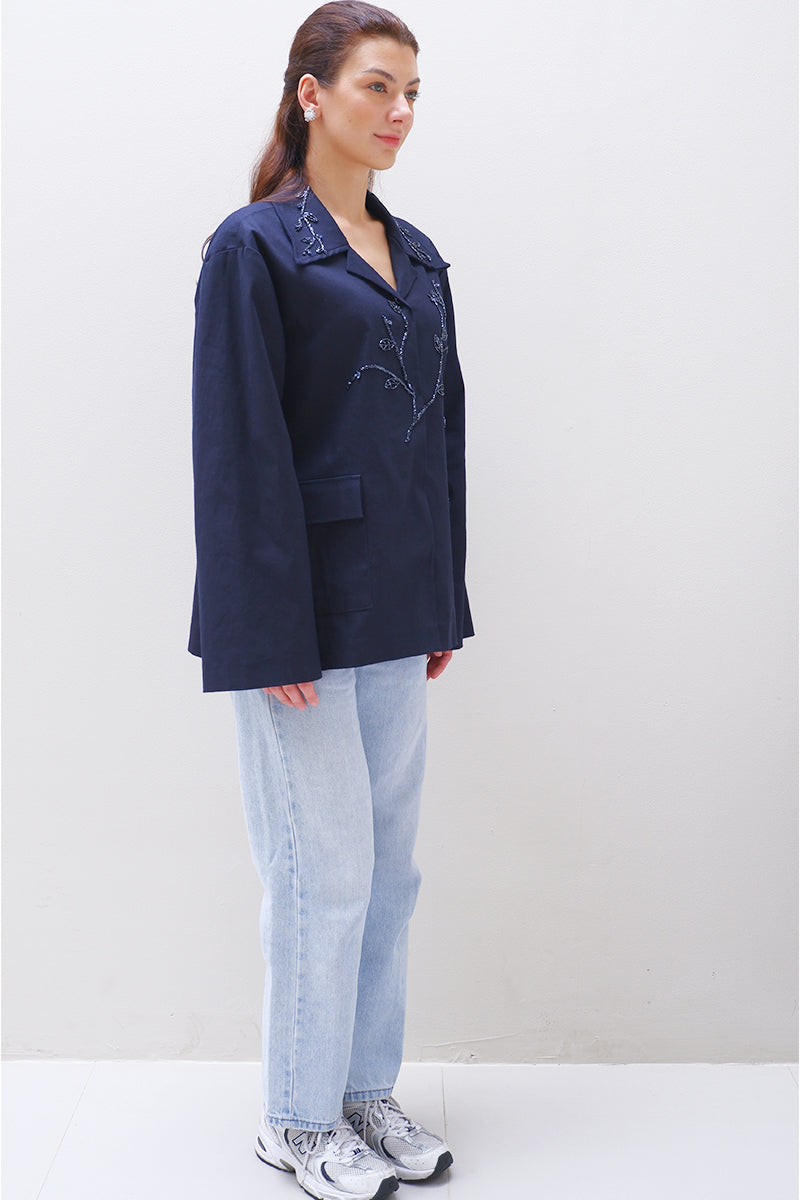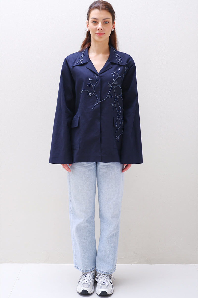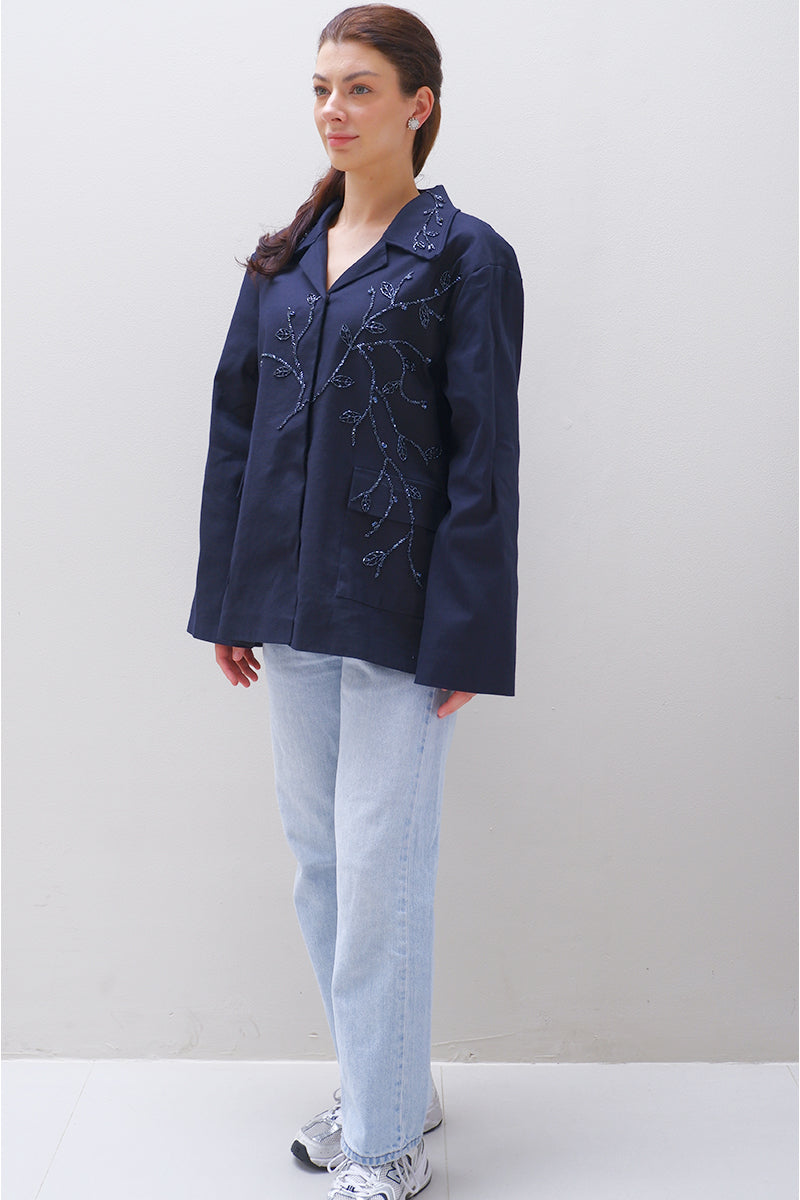 جاكيت شينو كحلي اللون، مزين بزخارف دقيقة من الخرز والكريستال بنقوش رقيقة على شكل أغصان وأوراق. يتميز بياقة كلاسيكية مدببة، وأكمام طويلة، وجيوب أمامية.