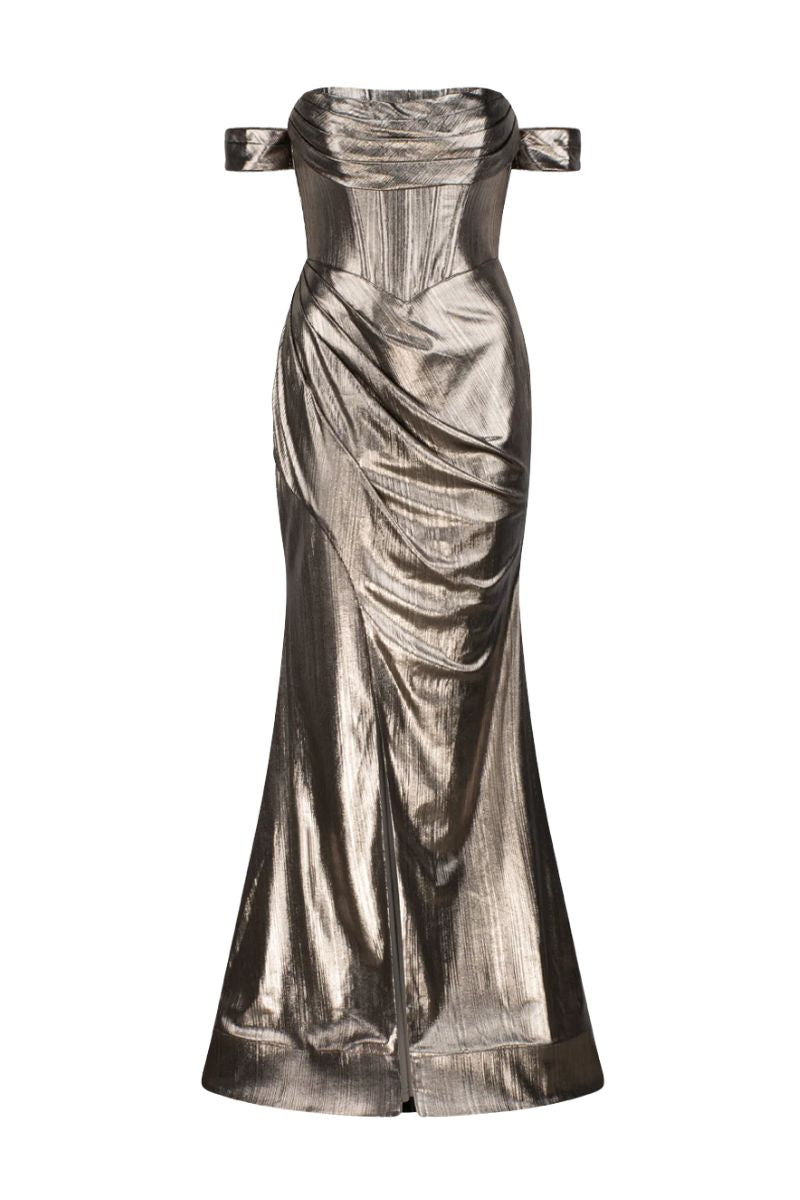 - تنورة متقاطعة بطول كامل مع تفاصيل ثنية غير متماثلة وشق جانبي أمامي