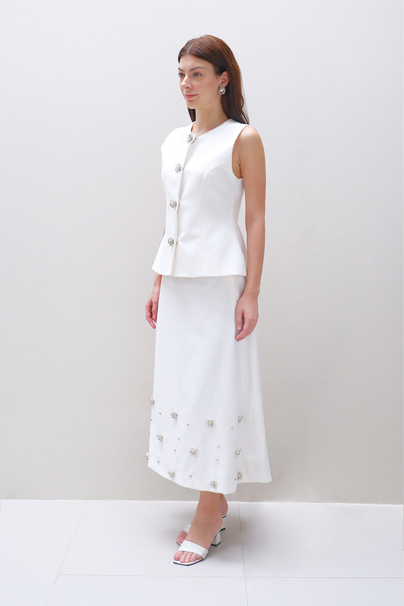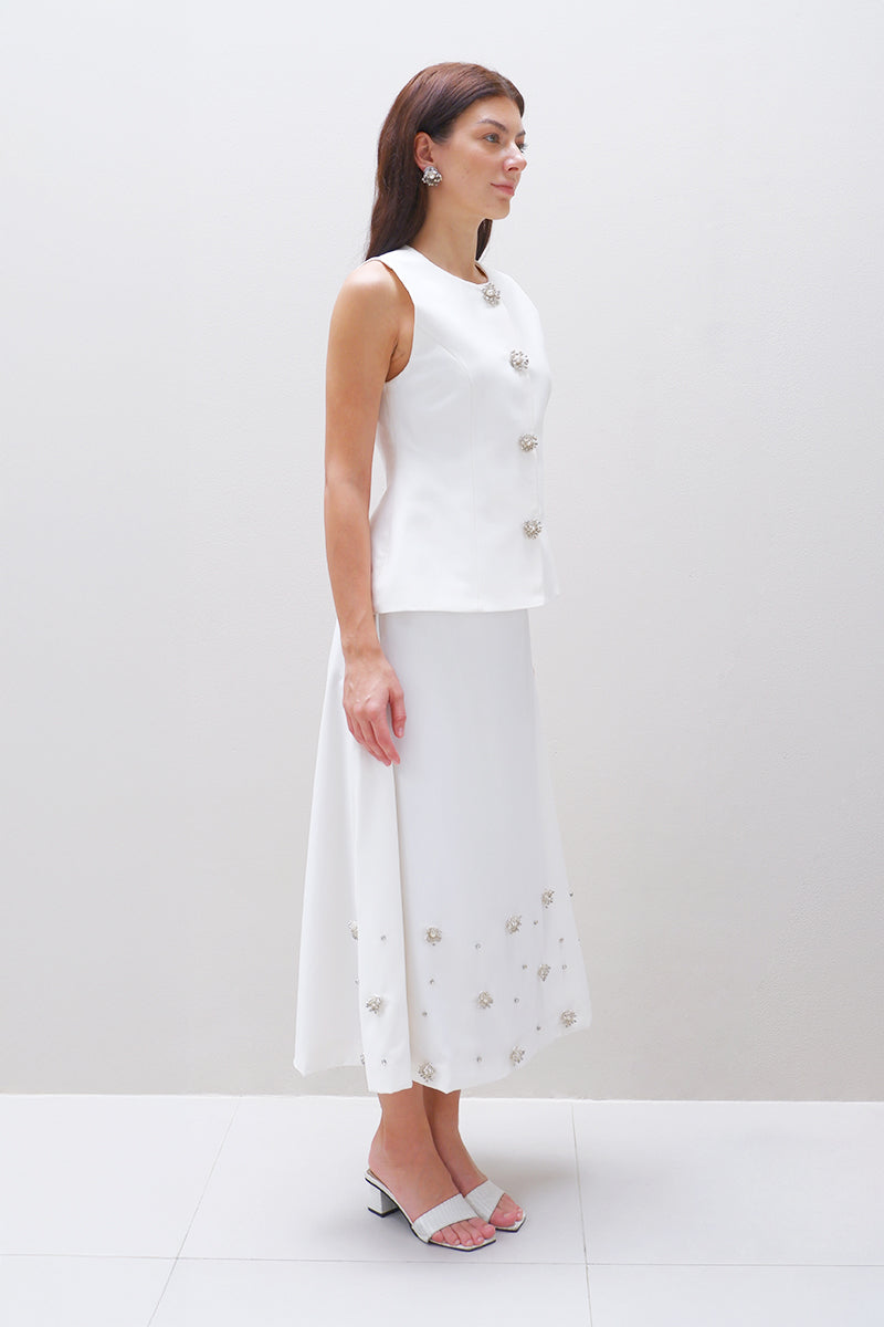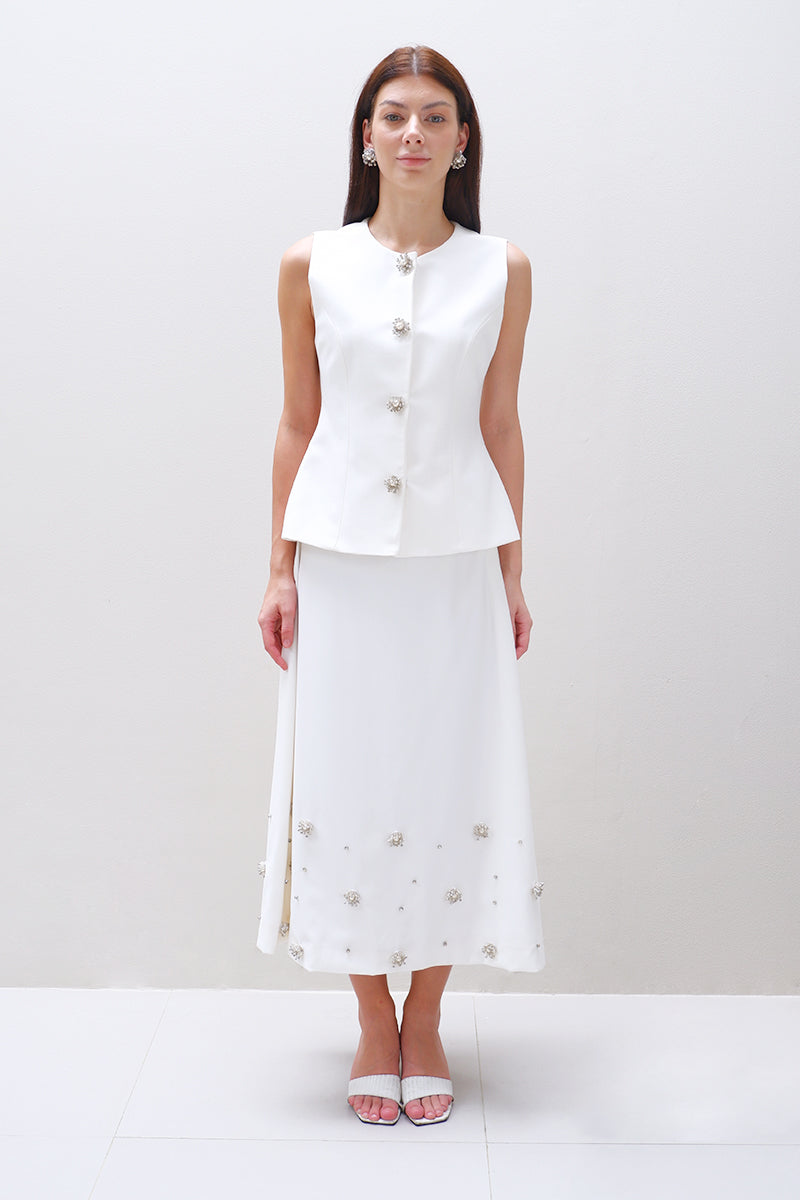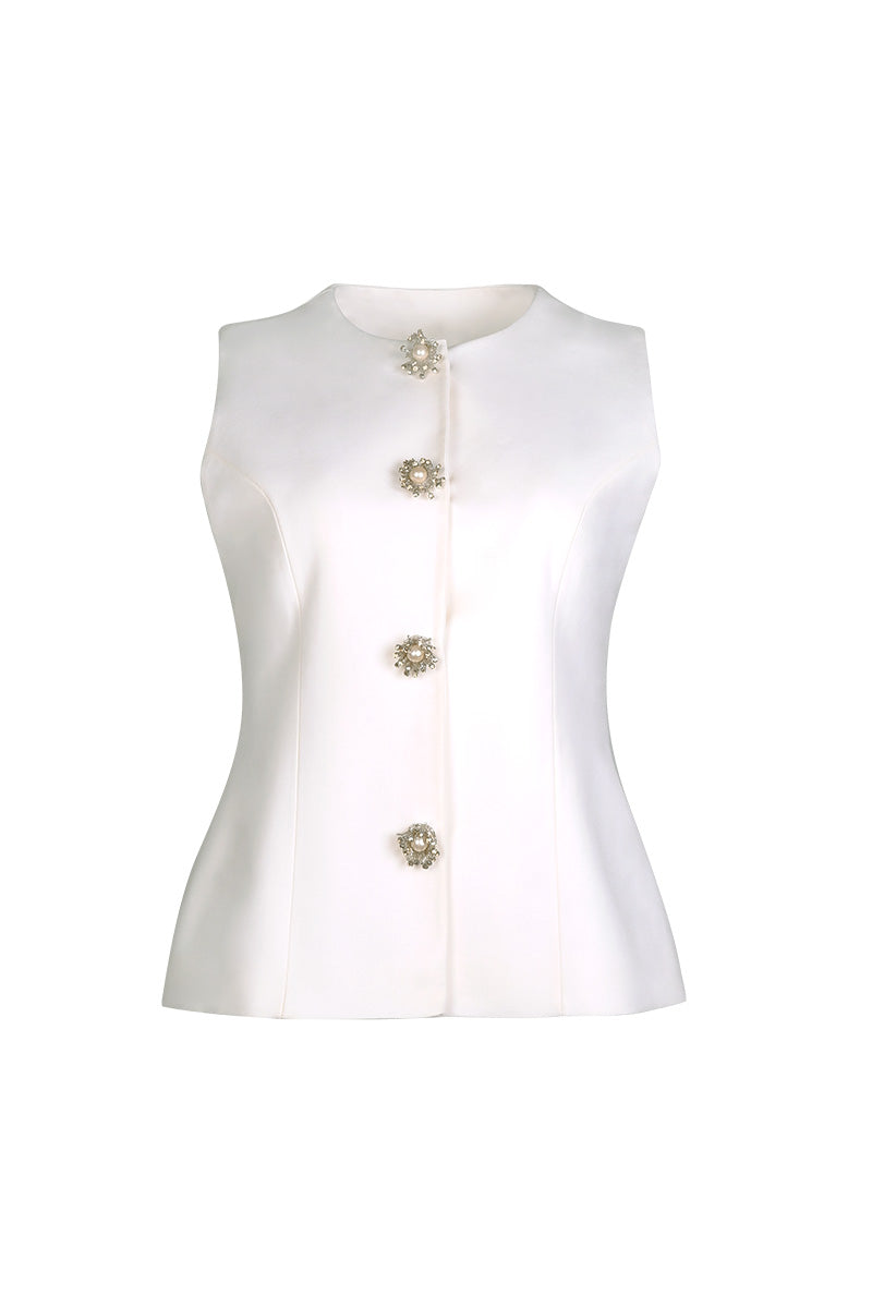 بلوزة بيضاء أنيقة بدون أكمام، مزينة بأزرار مزخرفة باللؤلؤ الصناعي والكريستال وخرز فضي لامع. تصميمها الأنيق والمصمم بدقة يضفي عليها سحرًا راقيًا.