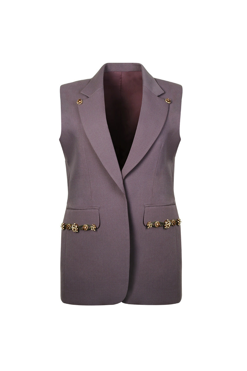 سترة أنيقة مصنوعة من قماش مستوحى من اللون الرمادي. مزينة بتفاصيل من الخرز ونقاط كريستال ذهبية اللون على الجانبين، وكريستالات بتصميم يشبه الألعاب النارية على الجيوب، تجمع بين الرقي العصري واللمسة الخالدة.