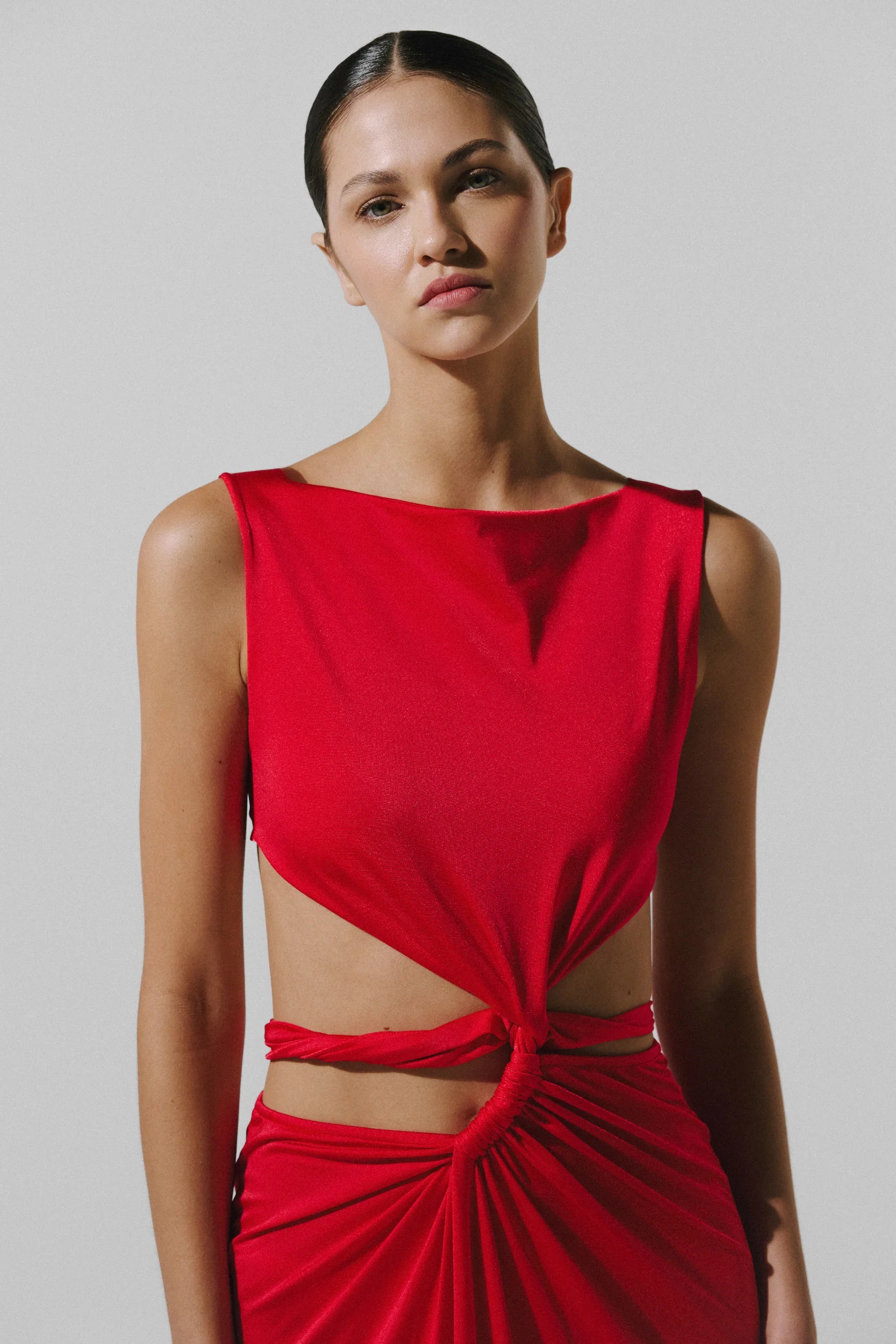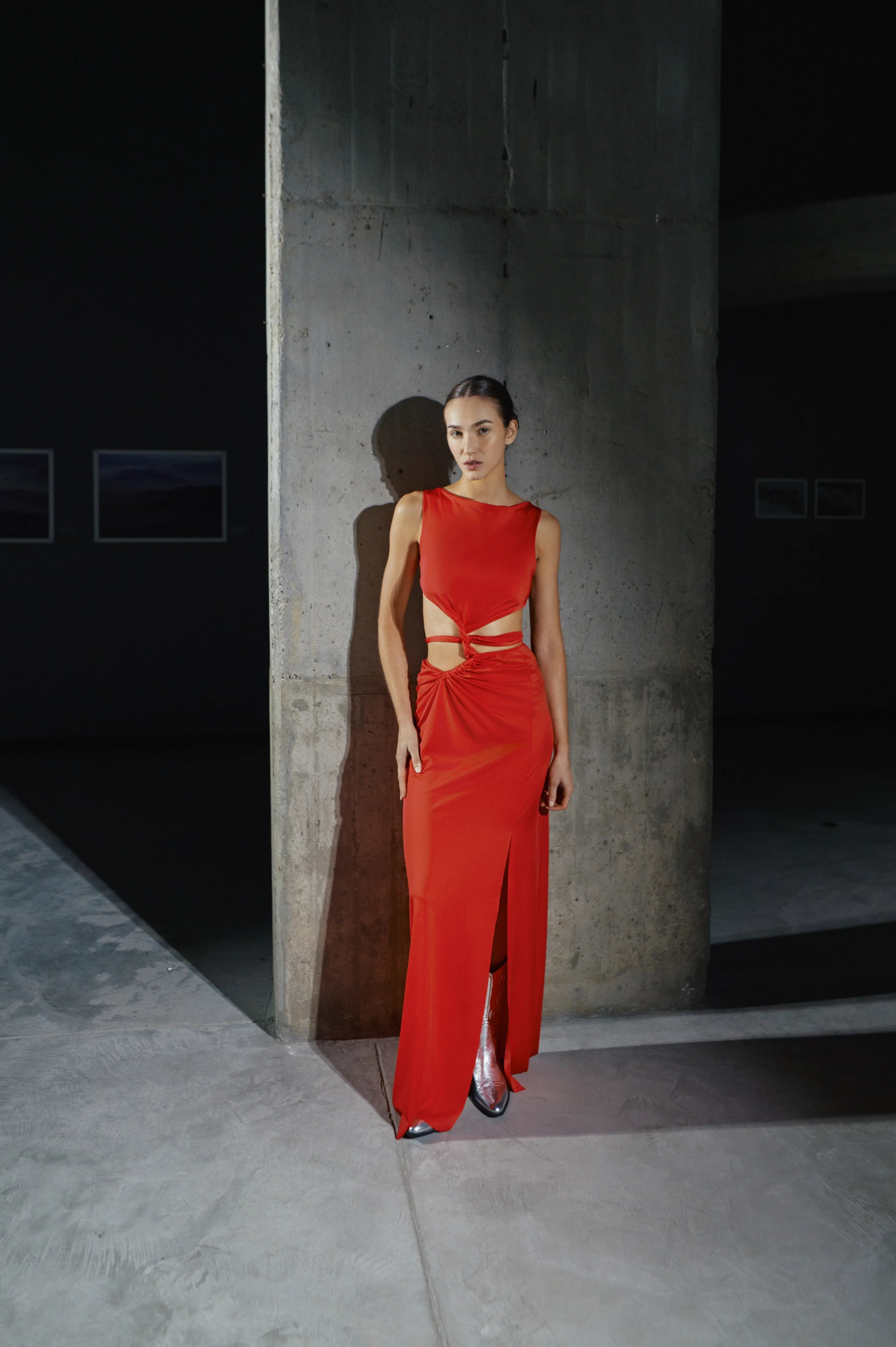 - طول طويل، رقبة عالية، تفاصيل خلفية ملتوية، كشكش عند الخصر، فتحات جانبية + حمالات