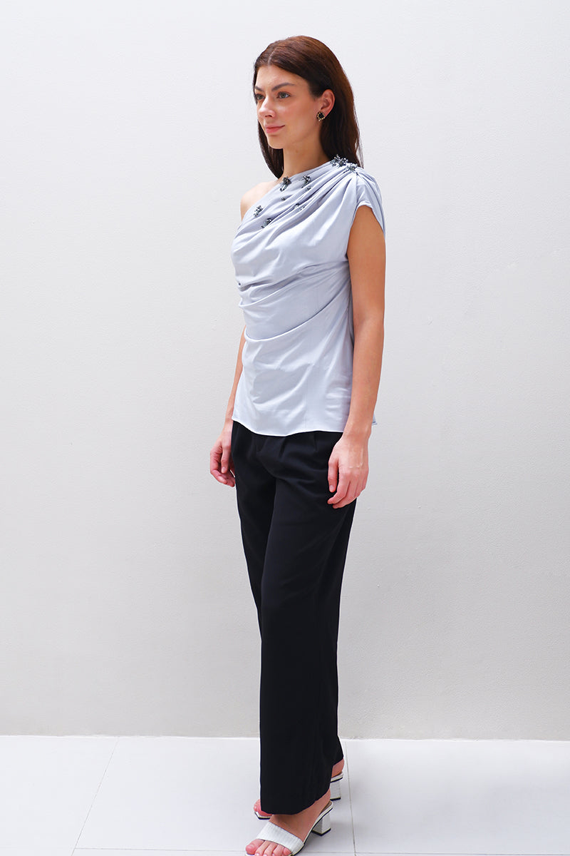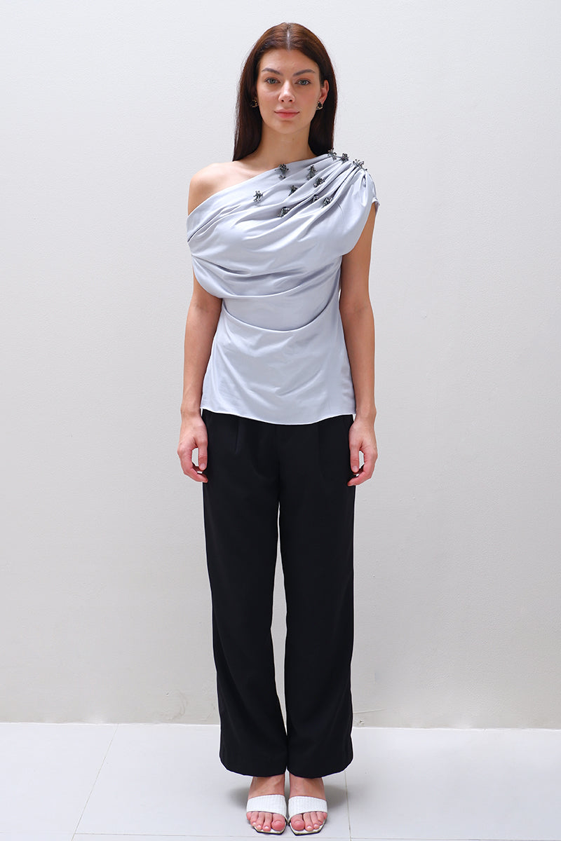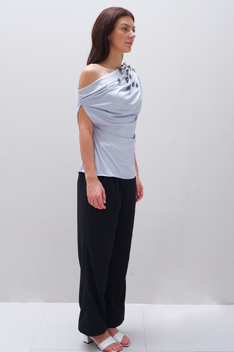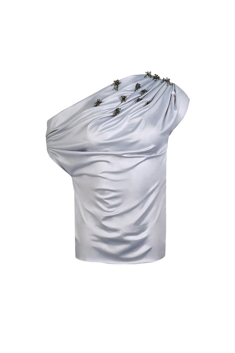 بلوزة بكتف واحد من قماش بني معدني، مزينة بخرز ذهبي وكريستالات من الأمام. طياتها المتتالية الأنيقة تُضفي لمسة عصرية فاخرة وراقية.