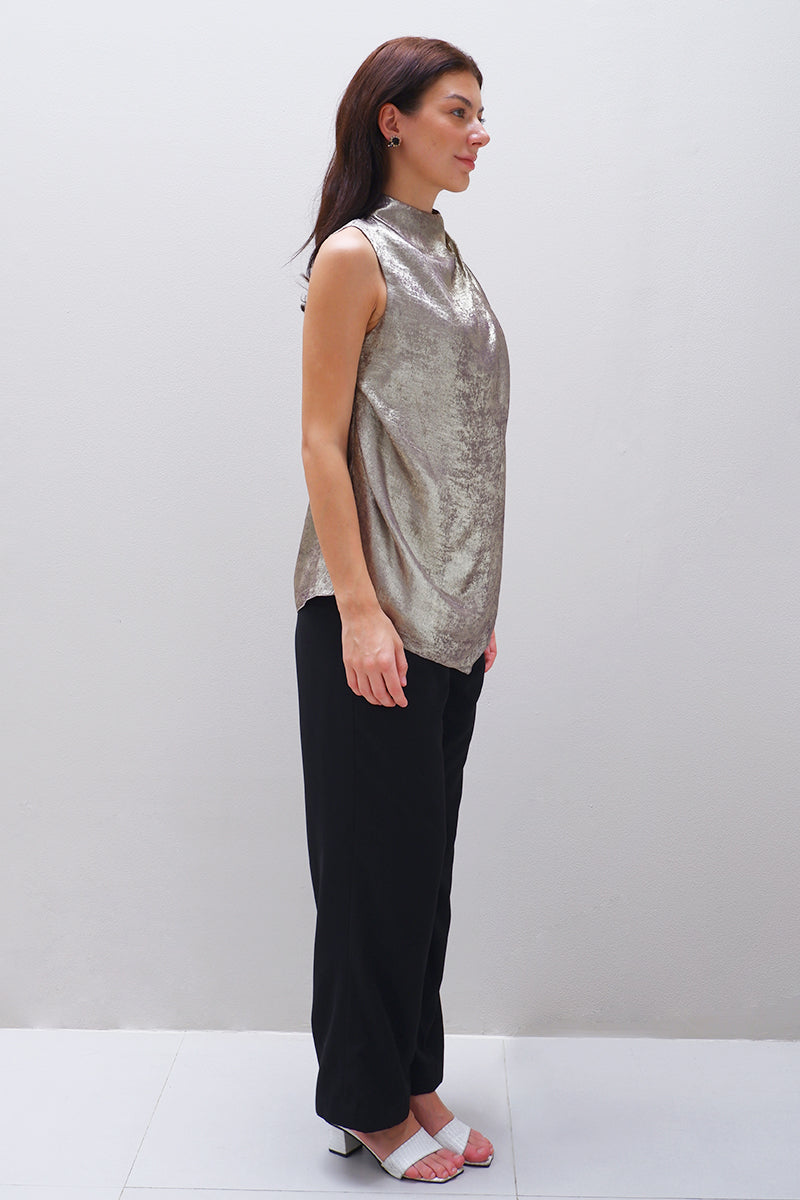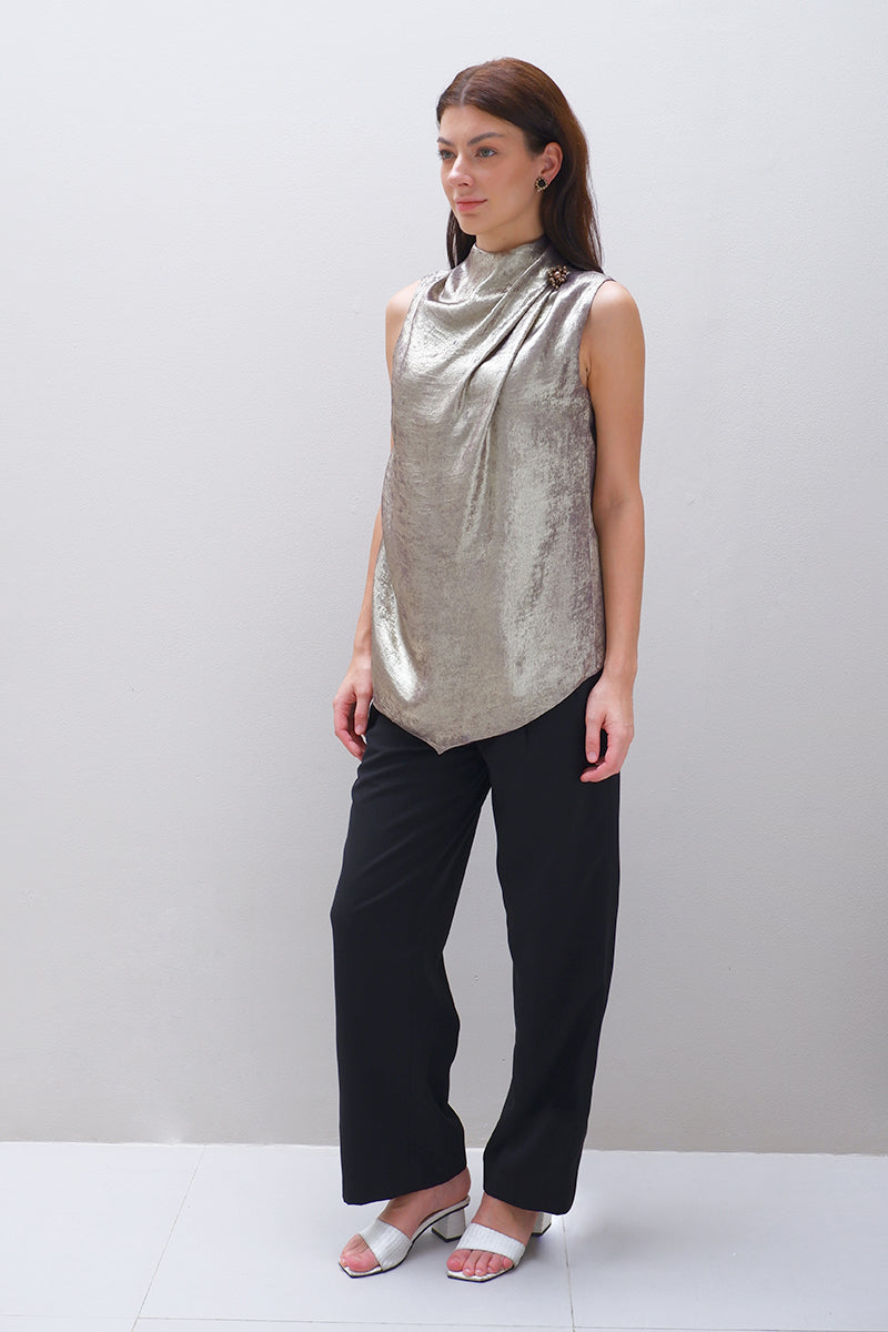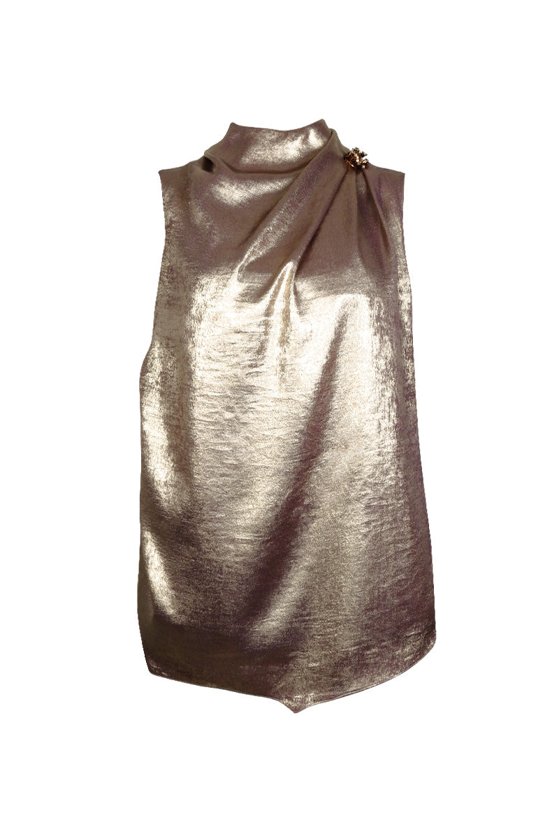 بلوزة ذهبية معدنية بدون أكمام، بفتحة رقبة واسعة. مزينة بلؤلؤة صناعية بنية اللون، وخرز بني، وكريستالات على الكتف العلوي، مما يضفي عليها لمسة فاخرة وراقية.