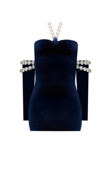 - يتميز الفستان القصير المخملي باللون الأزرق البحري بتصميم عصري أنيق مع ربطة عنق من اللؤلؤ وقفازات لؤلؤية طويلة
