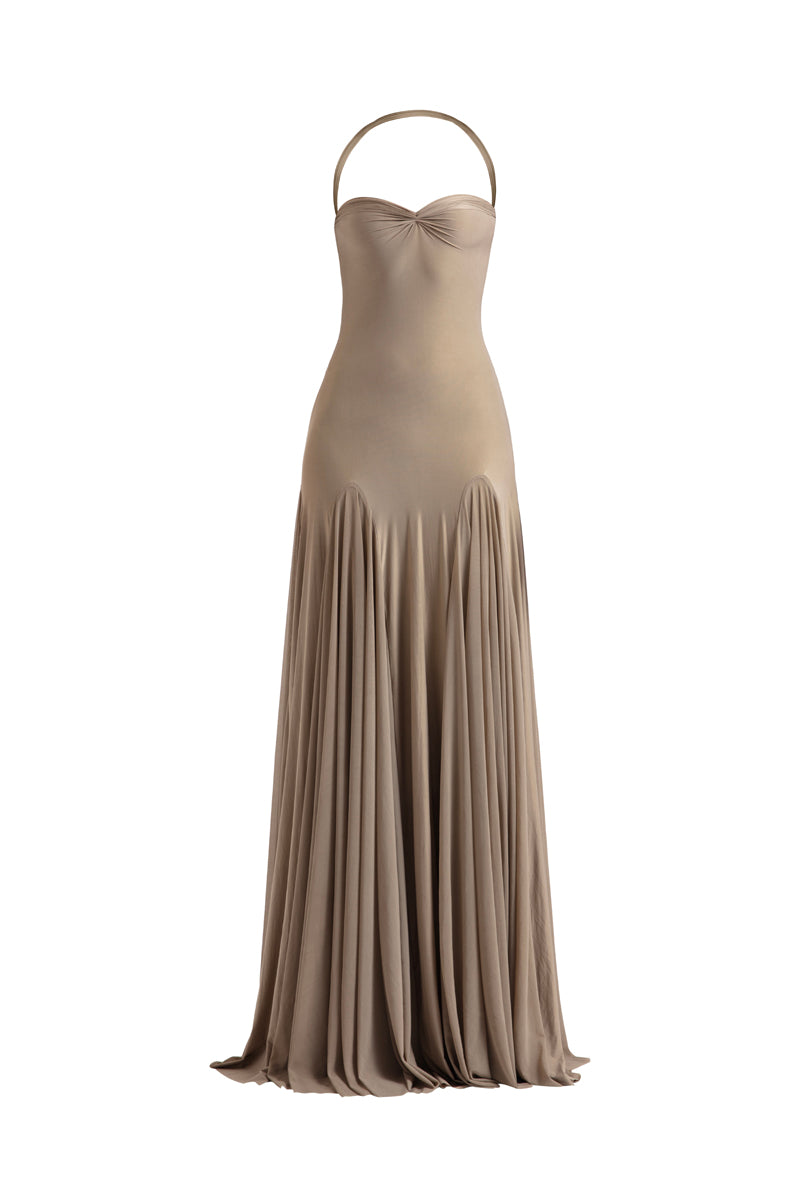 فستان بدون حمالات يتميز بفتحات عالية للحصول على شكل متسعة مع تكديس أنيق على الصدر.