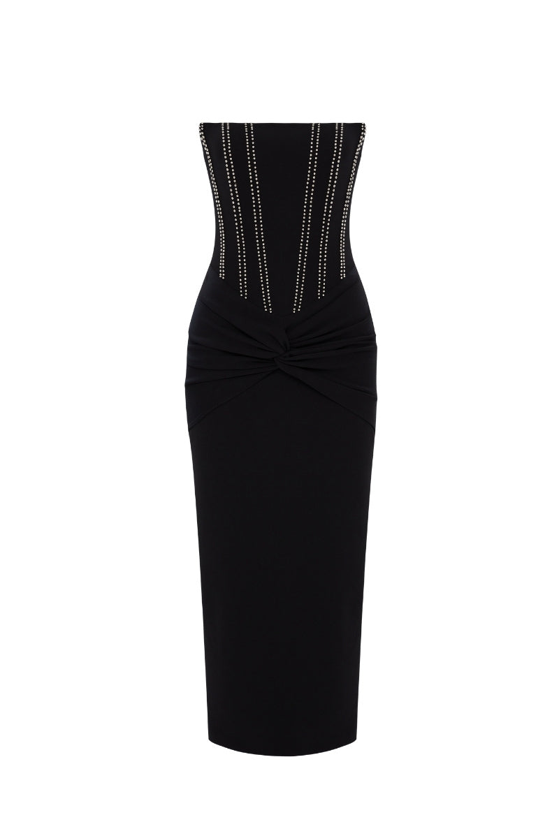 فستان ميدي بدون حمالات بتفاصيل مشد باللون الأسود