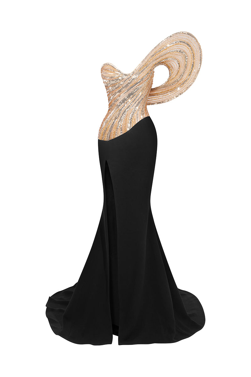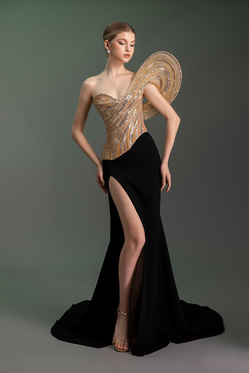- صُنع الجزء العلوي بدون حمالات من الترتر اللامع باللون الذهبي والنحاسي
