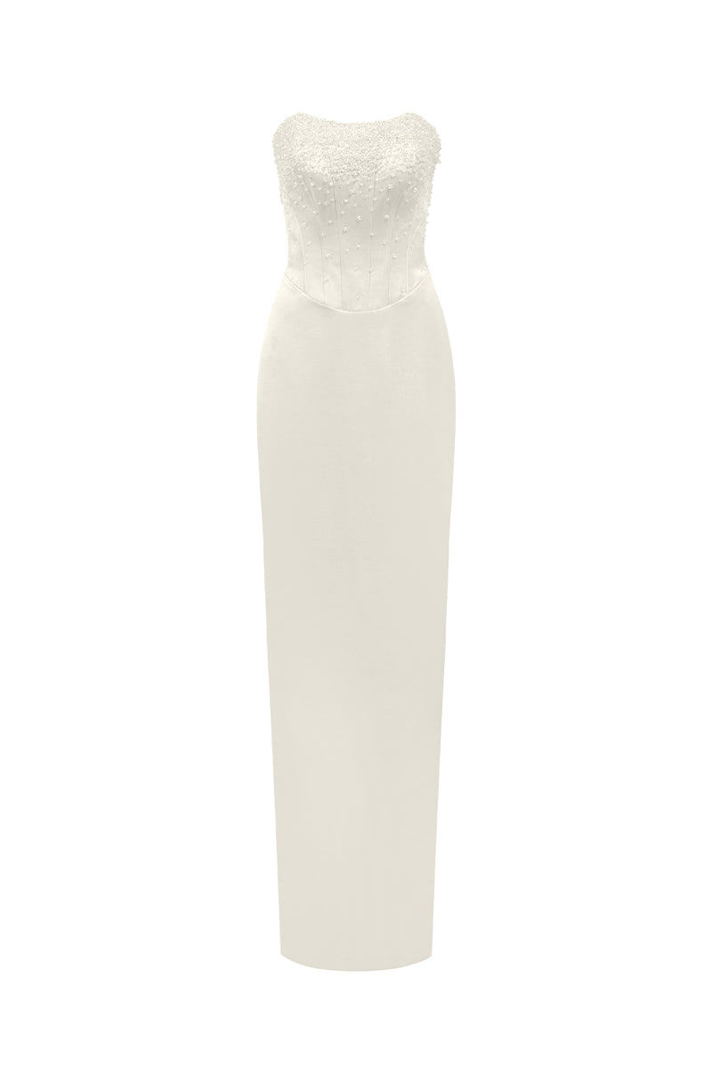 فستان ماكسي بدون حمالات بتصميم كورسيه بلون أبيض ناعم، مزين بتفاصيل كريستالية رقيقة على طوله. يُبرز الجزء العلوي المُصمم بشكل مُنظم قوامك، بينما تُضفي التنورة الأنيقة التي تصل إلى الأرض لمسةً من الطول. يُجسد هذا الفستان أناقةً خالدة مع لمسة عصرية راقية.