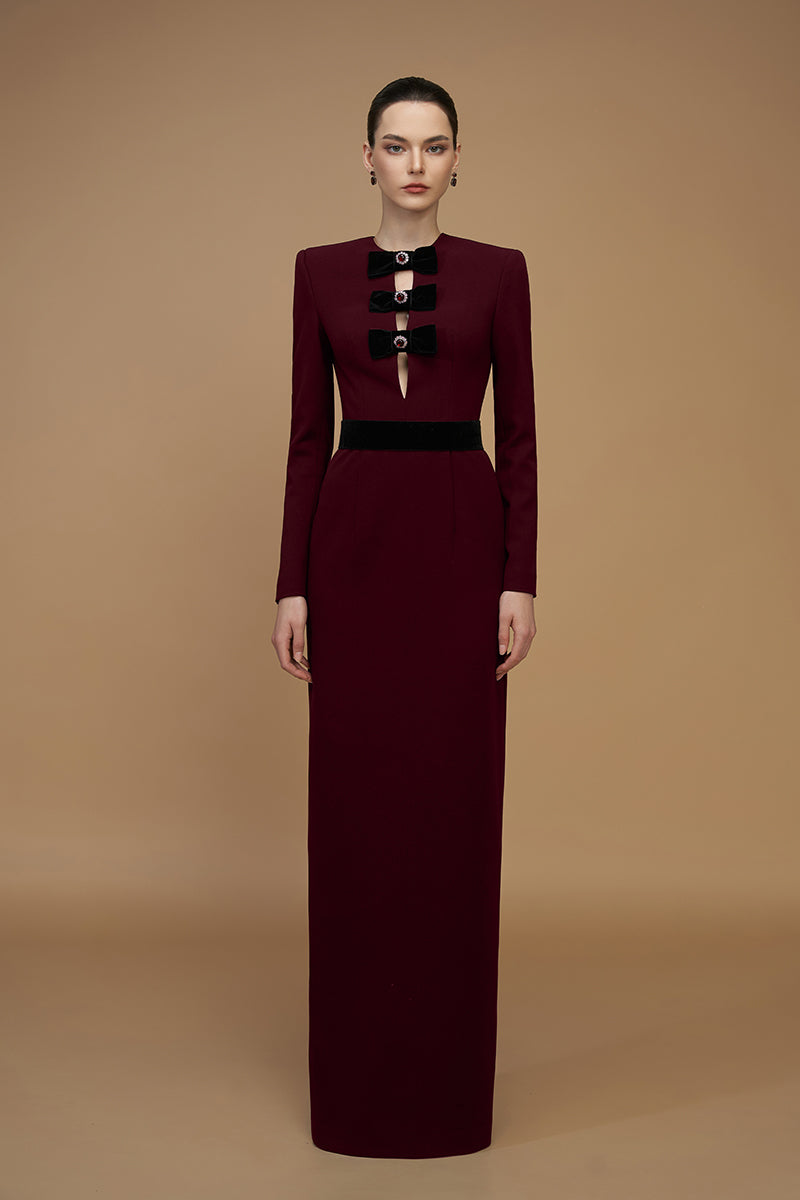 فستان نبيذي من الكريب دي شين والمخمل