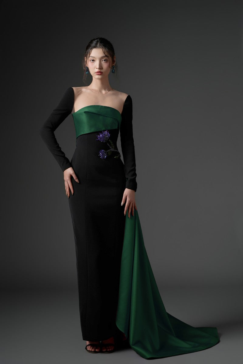 فستان فاربيون من الكريب والتفتا الملكي باللونين الأسود والأخضر