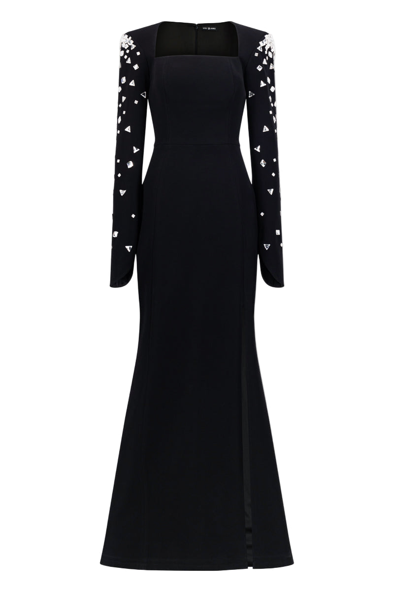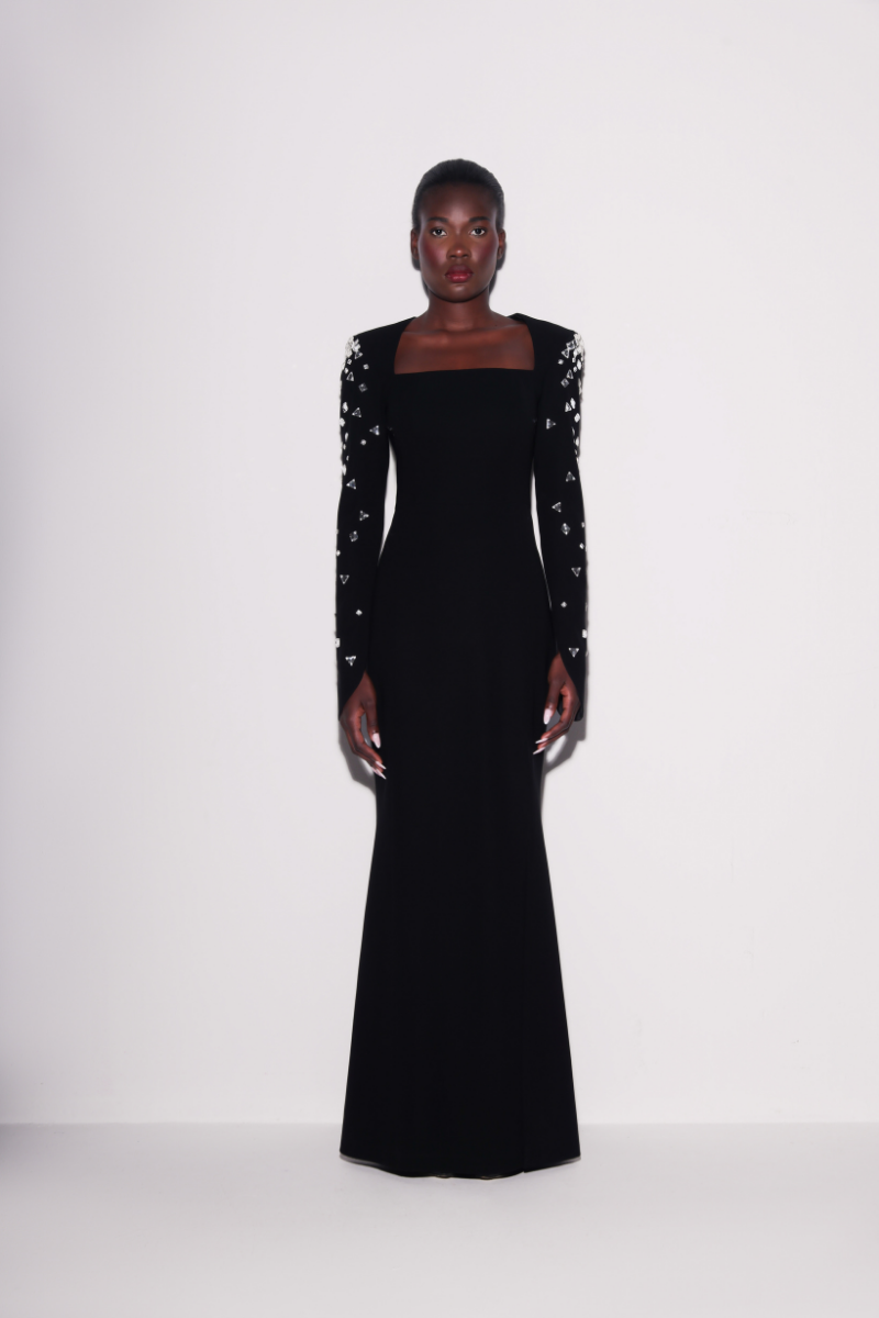 - أكمام طويلة مع أساور ممتدة وكريستالات