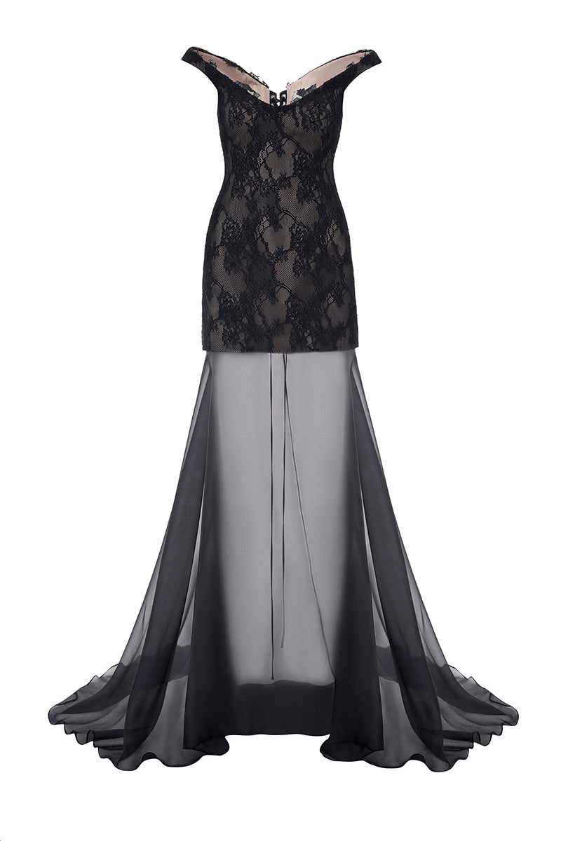 فستان من الدانتيل والشيفون باللون الأسود