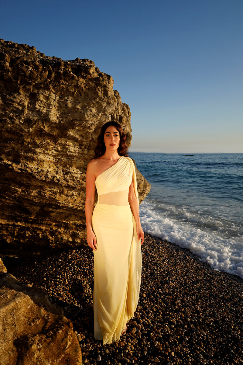 - فستان من التول الأصفر الزبدي غير المتماثل بكتف واحد