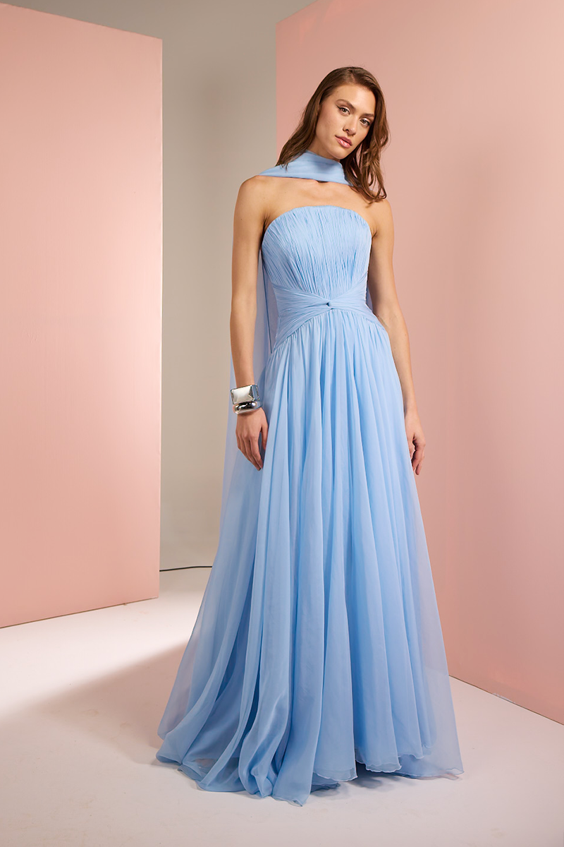 فستان بدون حمالات مع وشاح باللون الأزرق الفاتح