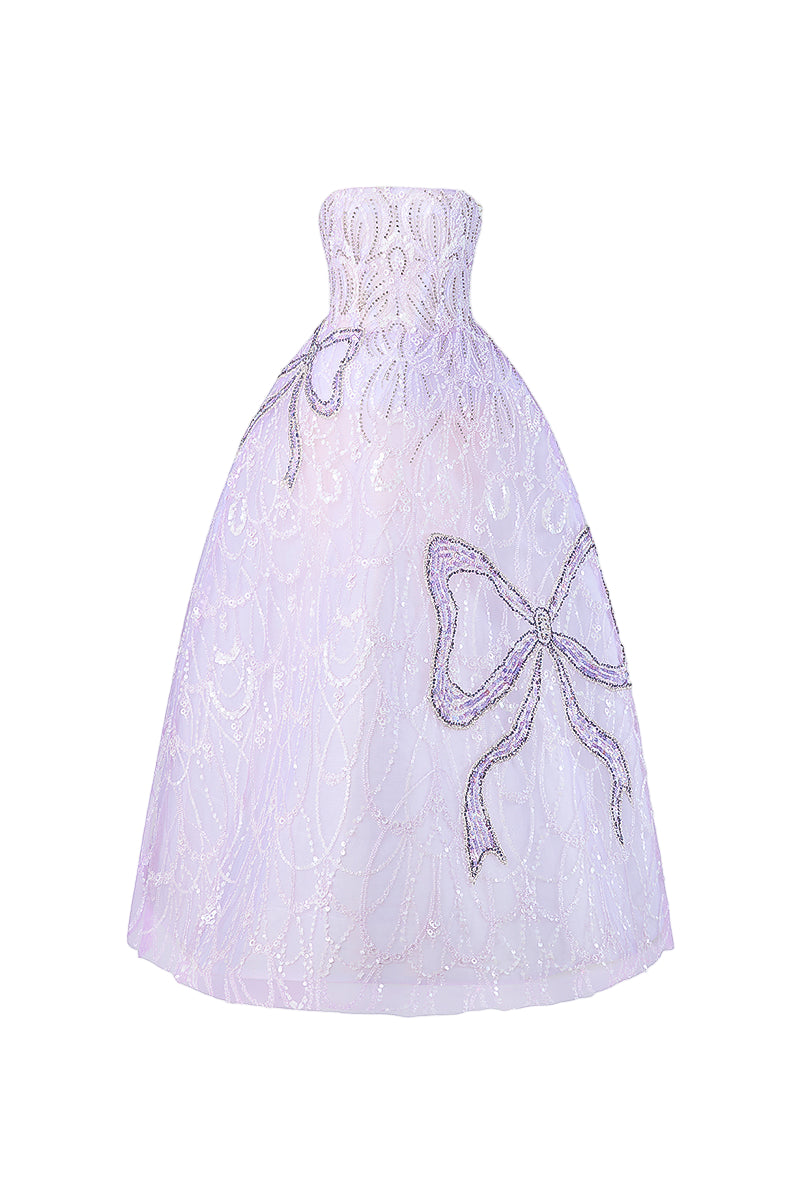 فستان سهرة بدون حمالات من التول أرجواني اللون