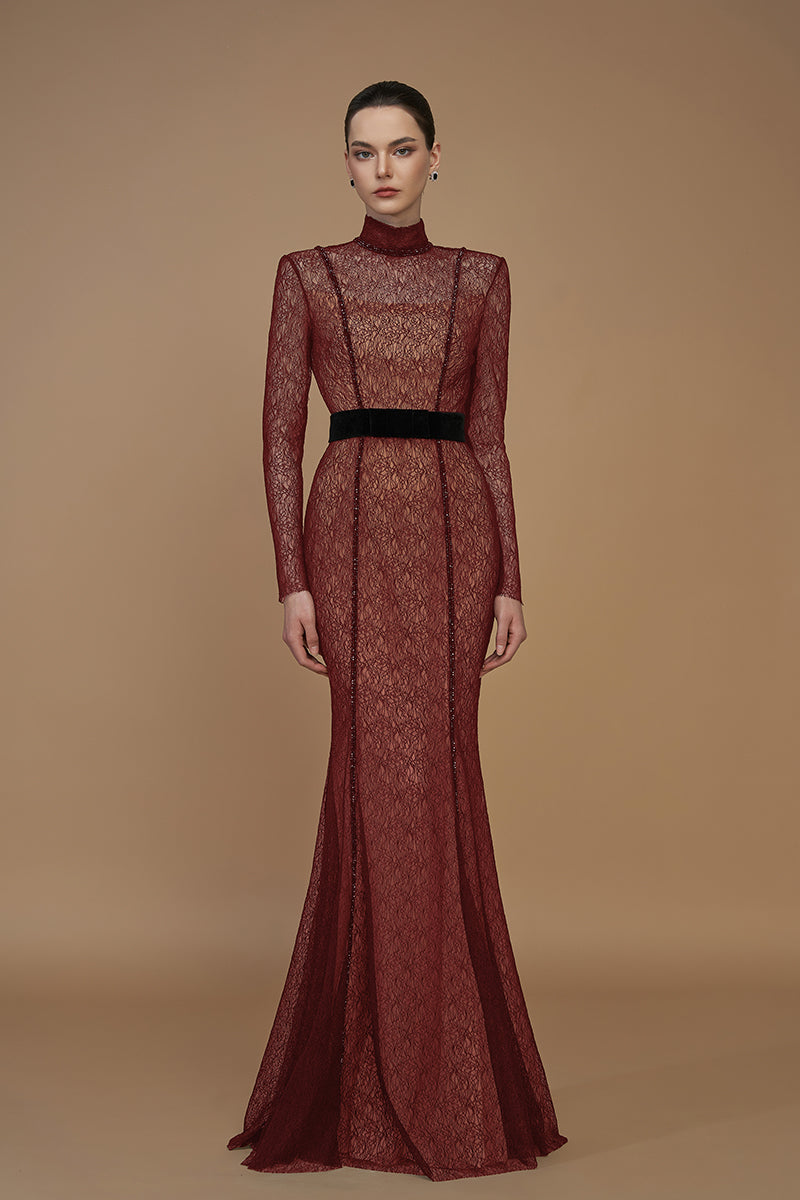 هذا الفستان بقصة حورية البحر بياقة مرتفعة وأكمام طويلة، يُجسّد الأناقة الجريئة وعمق الملمس. مصنوع من دانتيل الغيبور المتشابك، ومُحاط بمخمل ليون الفاخر، ليُبرز جمال الجسم بدقة وإتقان. تُضفي الياقة المرتفعة والأكمام الطويلة لمسةً من الرسمية الراقية، بينما تُزيّن الكريستالات خط العنق وخطوط التصميم المزدوجة، مُضيفةً لمعانًا رقيقًا. يُحدّد حزام فيونكة مخملي صغير الخصر، مُكمّلًا إطلالةً مُصمّمة لأمسيات تجمع بين القوة والرزانة.