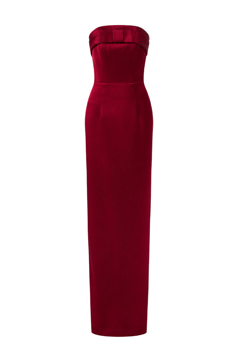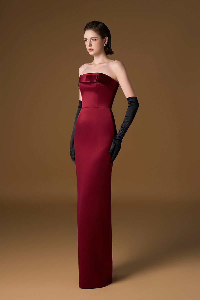 فستان عمودي بدون حمالات من الساتان اللامع، يُجسّد سحر الأنوثة العصرية بأناقة خالدة. صُمّم الفستان بقصّة منحوتة ولمعان ناعم، ليحتضن الجسم بانسيابية أنيقة. يُزيّن فيونكة ساتان لافتة الحزام، مُضيفةً لمسةً من الدراما والرومانسية، مُجسّدةً بذلك الرقيّ والثقة الهادئة.