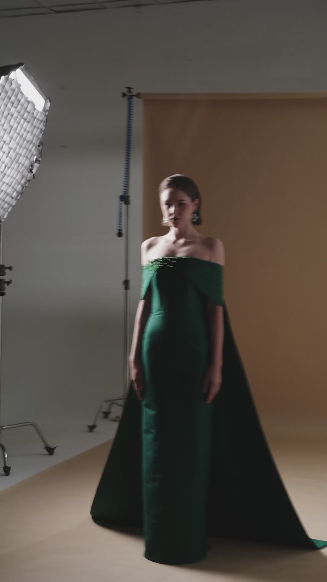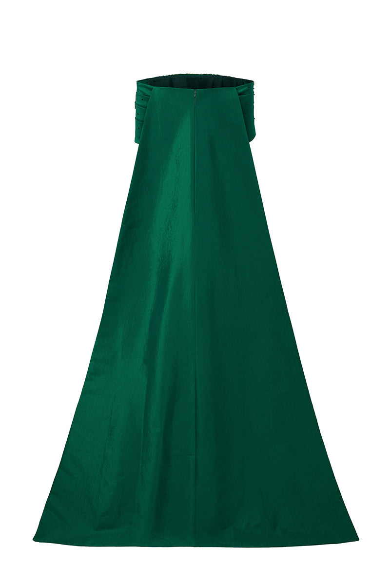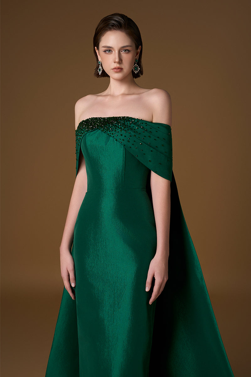 فستان آسر بدون حمالات، مصنوع من قماش التفتا المبطن بالحرير، يمزج بين الرقي الخالد والجاذبية العصرية. تصميمه العمودي يُطيل قوام الفستان برشاقة، بينما تُضفي الأكمام المنسدلة المكشوفة الأكتاف والأكواب المزينة بالكريستال لمسةً من الفخامة. يُضفي ذيل الفستان الممتد لمسةً ملكية، مثاليًا للمناسبات الكبرى واللحظات التي لا تُنسى.