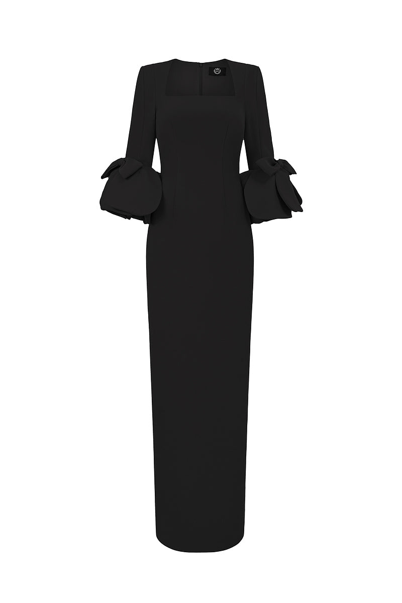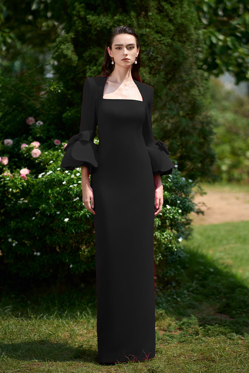 فستان أسود عمودي بفتحة رقبة على شكل شبه منحرف وأكمام وردية بطول ثلاثة أرباع