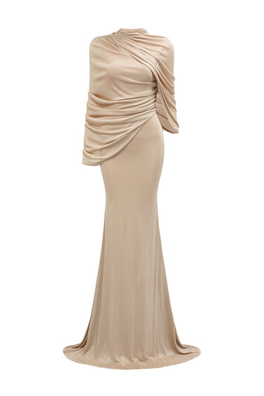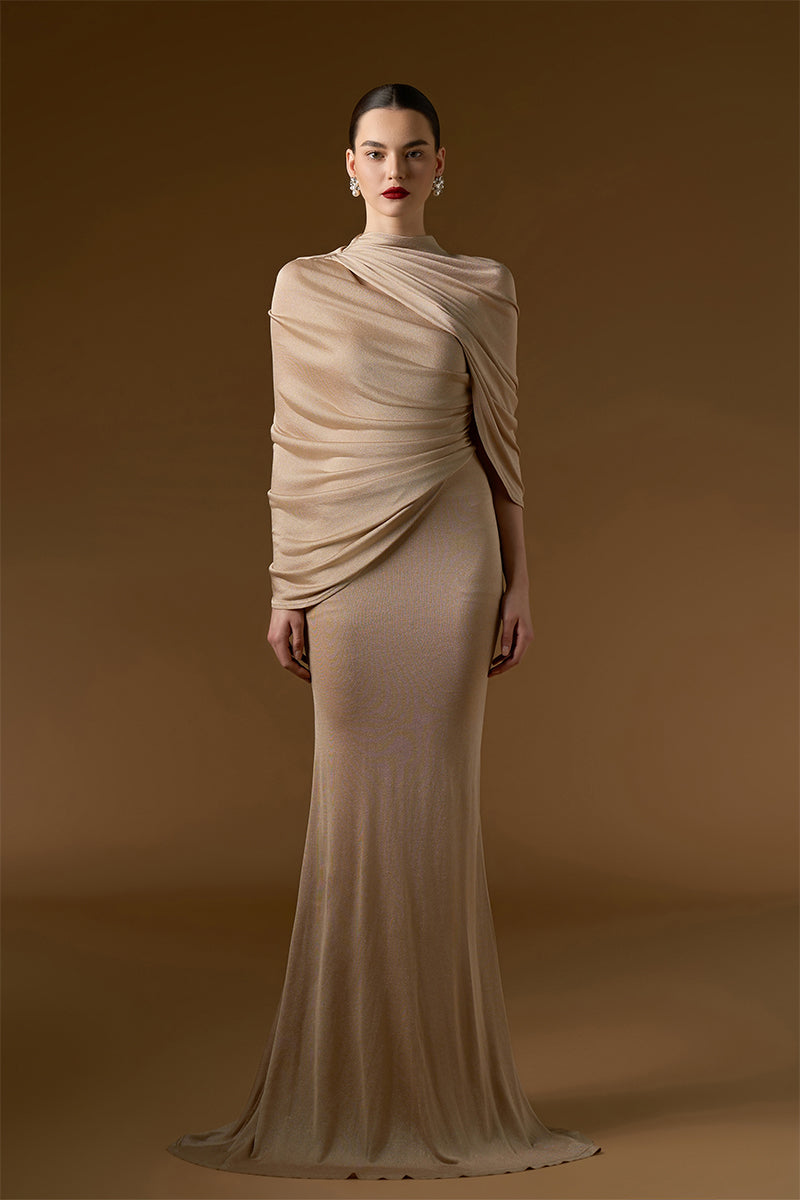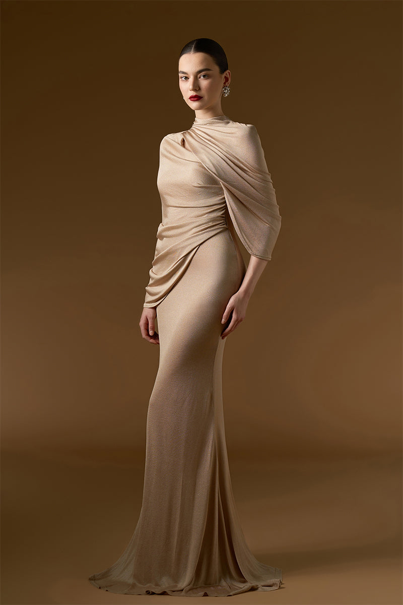 هذا الفستان الطويل بقصة حورية البحر، المصنوع من قماش جيرسي لامع، يجمع بين الفخامة والأناقة. يُبرز القماش المرن قوام الجسم بقصة حورية البحر المثالية، مما يمنحه شكلاً جذاباً وجذاباً. يُضفي العنق المستدير لمسة من الرقي الكلاسيكي، بينما تُضفي الأكمام غير المتماثلة المنسدلة لمسة عصرية ودراميةً. ينسدل القماش المطوي متعدد الطبقات برشاقة على كتف واحد، مُضيفاً عمقاً وحركةً إلى الفستان. يُوازن هذا الفستان بسلاسة بين الجمال الخالد والأناقة العصرية الجريئة، مما يجعله خياراً لا يُنسى لأي مناسبة أنيقة.