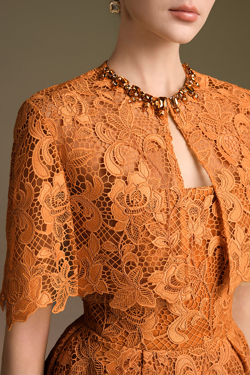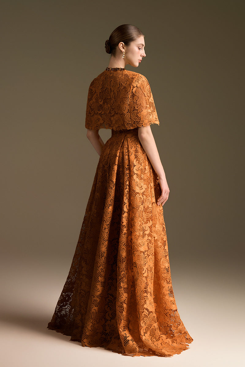 يُبرز الفستان ذو القصة على شكل حرف A والمصنوع من دانتيل غيبور والمبطن بالحرير أناقة راقية. صُمم الفستان بياقة بلا حمالات وبلا أكمام مع كاب صغير رقيق، مما يُبرز الكتفين بجمال آخاذ. تُزين مجموعات الكريستال زهور الدانتيل، بينما تُضفي الأحجار حول ياقة الكاب بريقًا خفيفًا. يُضفي الهيكل المرن قليلًا وقصة A-line الانسيابية حركة سلسة.