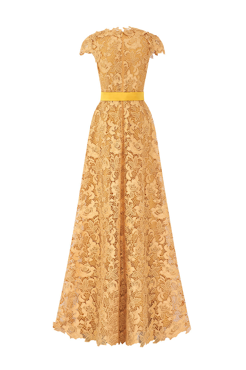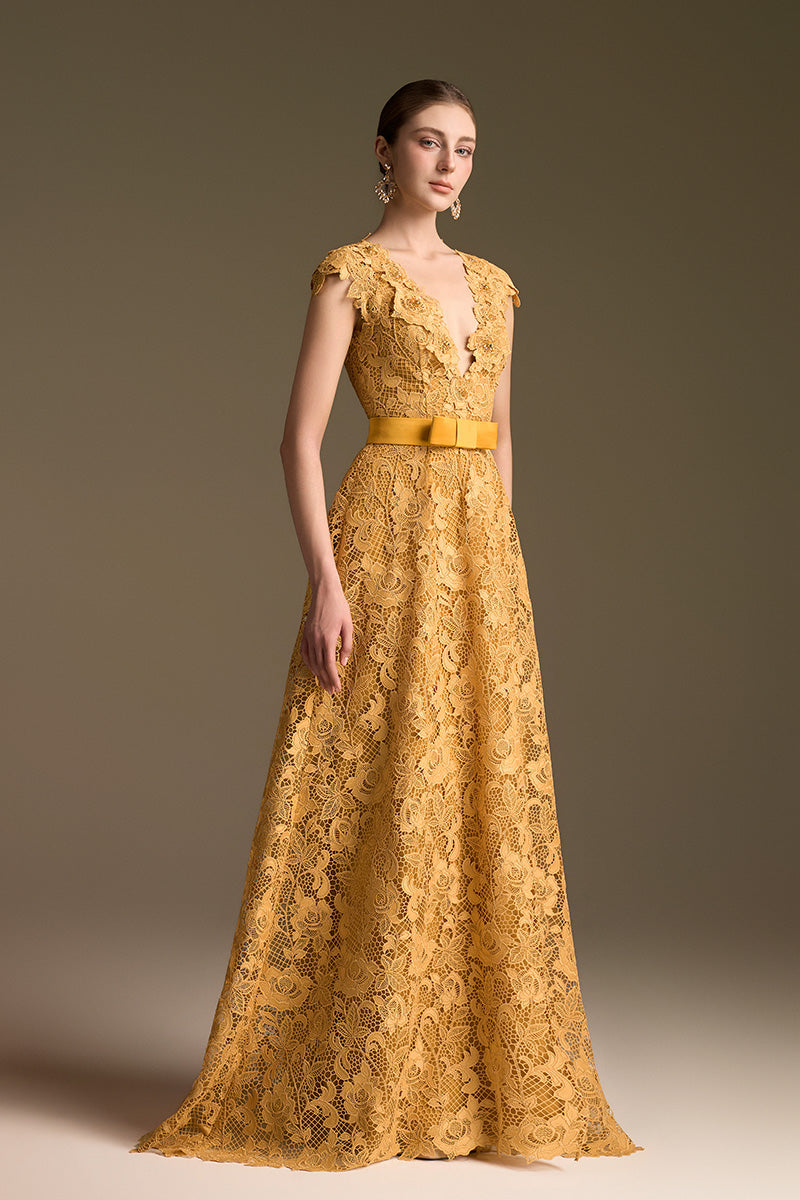 فستان سهرة على شكل حرف v من الدانتيل الأصفر بقصة a-line من cult mia x i.h.f