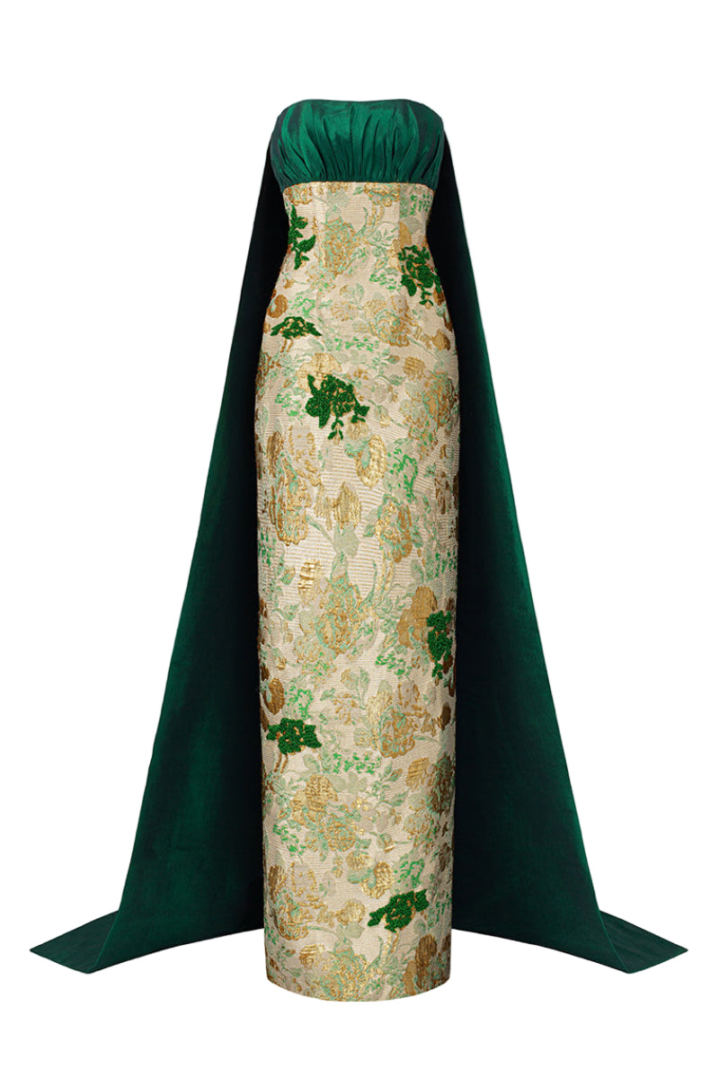 فستان عمودي بدون حمالات، مصنوع من قماش الجاكار المعدني المزهر باللون الأخضر، يمزج بين الأناقة الملكية والحرفية الراقية. يُضفي الصدر المنحوت وذيل الفستان الطويل لمسةً من الأناقة، بينما تُضفي الأنماط الزهرية المطرزة بالكريستال لمسةً من الفخامة الخالدة. بتوازنٍ مثالي بين الجرأة والأناقة، تُجسد هذه القطعة أناقة المساء.
